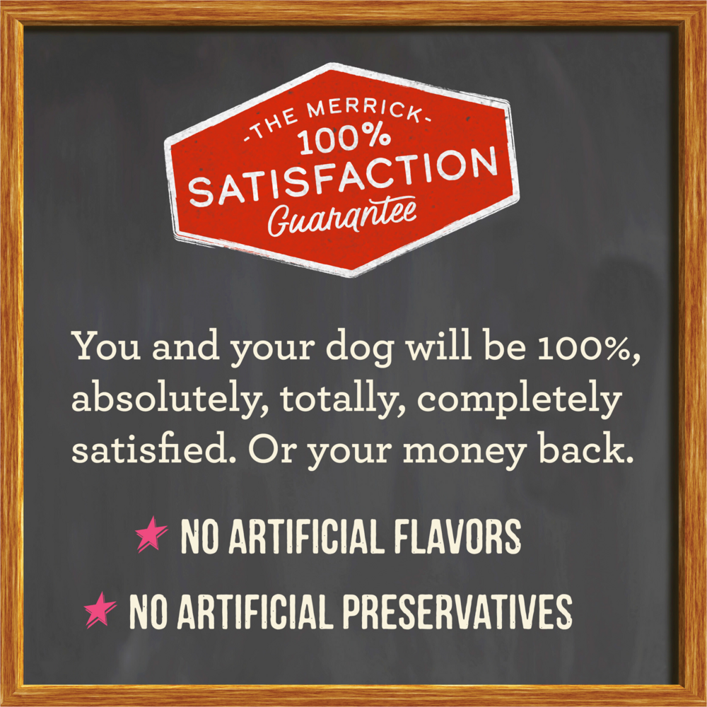 Merrick isn't your typical pet food company, and Merrick doesn't just make pet food. Merrick makes the best food ever for the best pet ever. Yours. The five star promise from Merrick is what's guaranteed to each and every dog and cat, along with their owners. Local growers, real whole foods, their own kitchen, balanced nutrition, and health you can see. Merrick creates real, wholesome recipes using USDA-inspected deboned meat and fresh produce for industry leading levels of protein, glucosamine and chondroitin. All of Merrick's foods are handcrafted in Hereford, Texas from USA farmers they know and trust. With no additives, sweeteners, colors or preservatives, real whole foods including high quality meats and fresh caught fish are the core of every Merrick dog and cat food. Merrick has been cooking their own foods in their own Texas kitchen for over 25 years. They stand behind their products with a 100% guarantee, promising that your dog or cat will be happier and healthier. You are what you eat, so why not feed your best friend the very best?