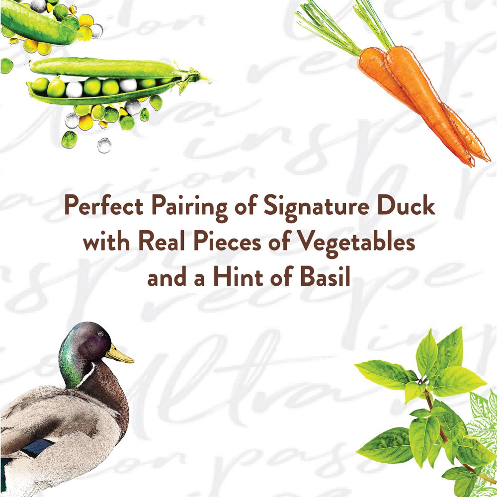 Chicken Broth, Duck, Chicken, Beef Liver, Pork Plasma, Tapioca Starch, Dried Peas, Dried Carrots, Dried Basil, Potassium Chloride, Calcium Carbonate, Salt, Dried Tomatoes, Choline Chloride, Xanthan Gum, Sodium Acid Pyrophosphate, Tetrasodium Pyrophosphate, Magnesium Proteinate, Sodium Hexametaphosphate, Zinc Sulfate, Vitamin E Supplement, Biotin, D-Calcium Pantothenate, Copper Sulfate, Thiamine Mononitrate (Vitamin B1), Vitamin B12 Supplement, Riboflavin Supplement (Vitamin B2), Potassium Iodide, Vitamin A Supplement, Pyridoxine Hydrochloride, Vitamin D3 Supplement.