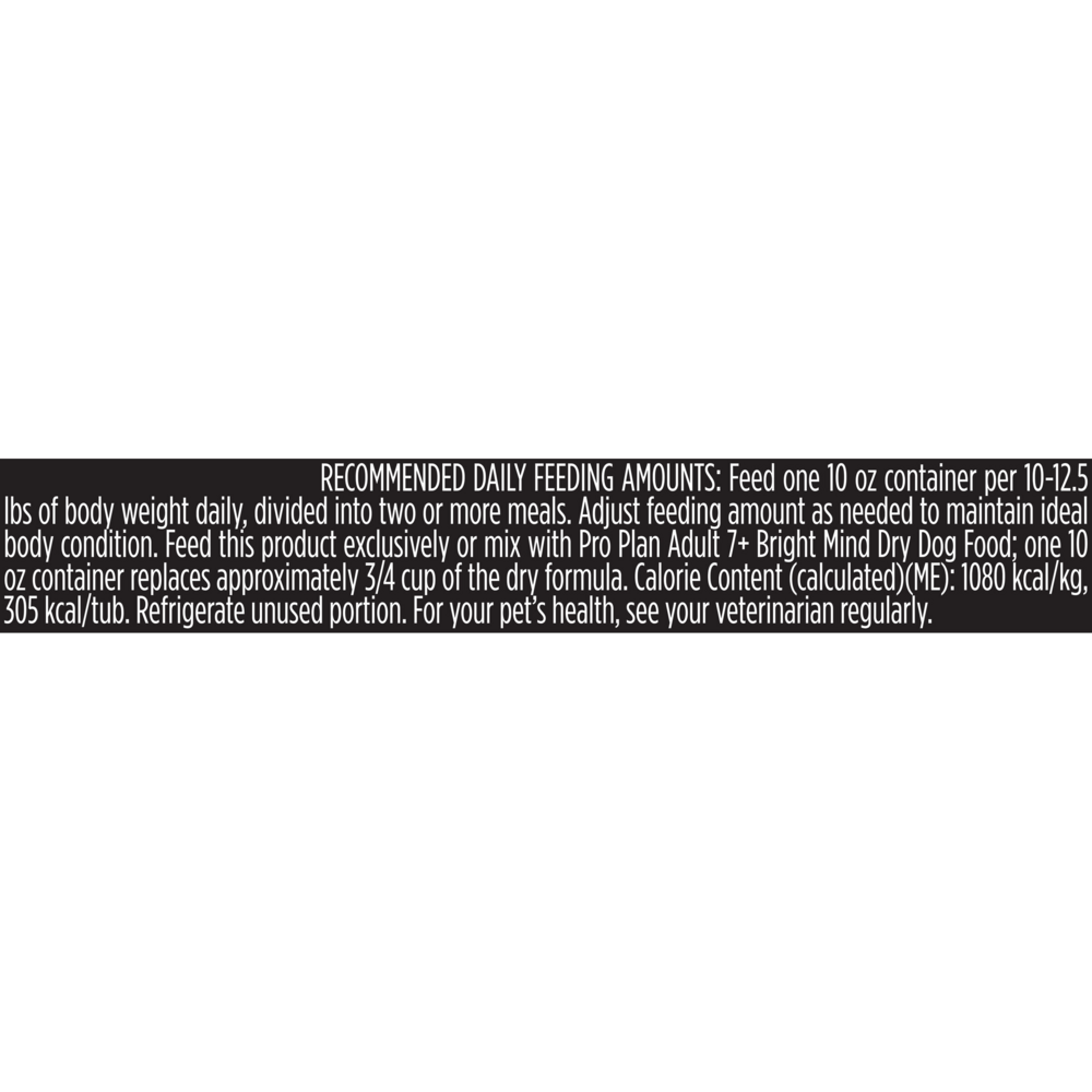From less interaction with you to lower engagement in daily activities, there are many signs your dog may be aging. Purina Pro Plan Bright Mind was created out of proprietary research that shows enhanced botanical oils provide an efficient fuel source for the brain in dogs age 7 and older - helping naturally nourish their minds to help them think more like they did when they were younger. Recommended Daily Feeding Amounts: Feed on 10 oz. container per 11-14 lbs of body weight daily, divided into two or more meals. Adjust feeding amount as needed to maintain ideal body condition. Feed this product exclusively or mix with Pro Plan Bright Mind Adult 7+ Dry Dog Food; one 10 oz. container replaces approximately 3/4 cup of the dry formula. After opening, refrigerate and use within 2 to 3 days.