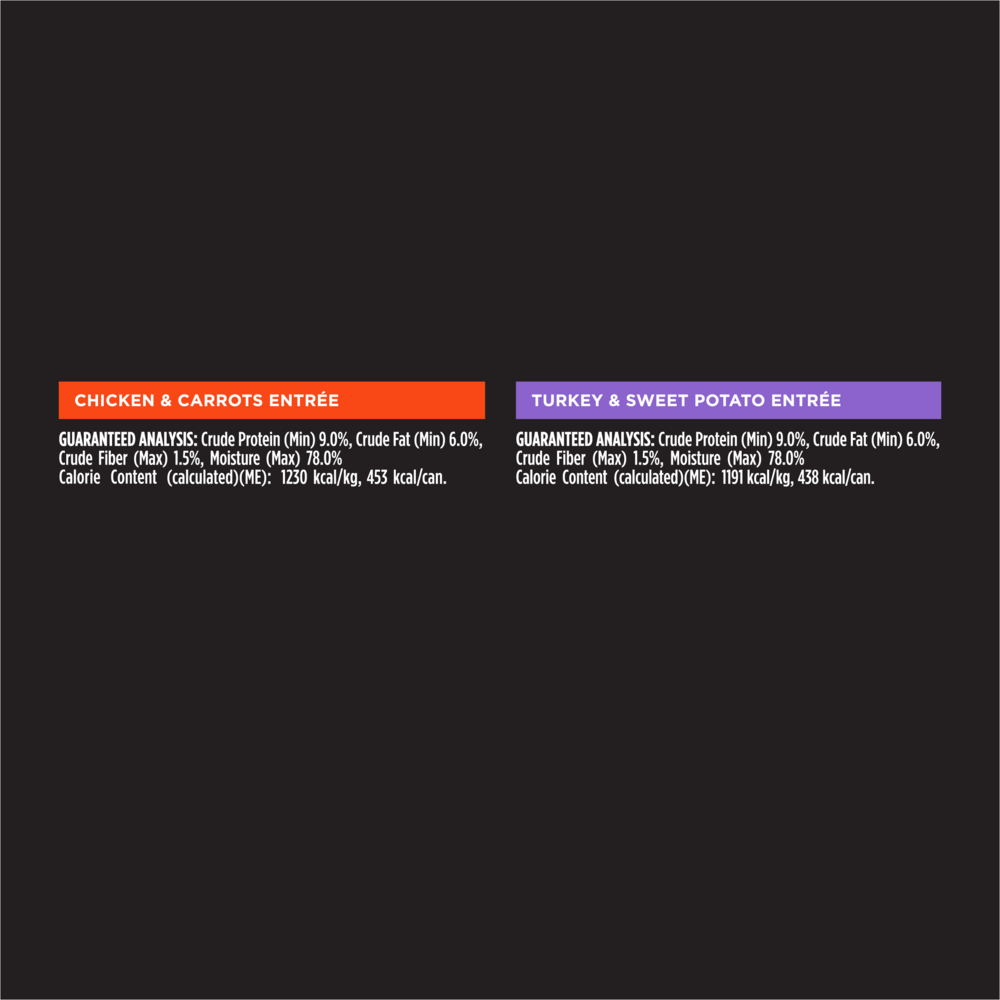 Turkey & Sweet Potato: Turkey, water, liver, meat by-products, chicken, sweet potatoes, guar gum, MINERALS[potassium chloride, zinc sulfate, ferrous sulfate, copper sulfate, manganese sulfate, potassium iodide,sodium selenite], salt, carrageenan, fish oil, VITAMINS [Vitamin E supplement, niacin, thiaminemononitrate, calcium pantothenate, pyridoxine hydrochloride, Vitamin B-12 supplement, riboflavinsupplement, Vitamin A supplement, folic acid, Vitamin D-3 supplement, biotin], choline chlorideChicken & Carrots: Chicken, water, liver, meat by-products, carrots, guar gum, MINERALS [potassiumchloride, zinc sulfate, ferrous sulfate, copper sulfate, manganese sulfate, potassium iodide, sodiumselenite], salt, carrageenan, fish oil, VITAMINS [Vitamin E supplement, niacin (Vitamin B-3), thiaminemononitrate (Vitamin B-1), calcium pantothenate (Vitamin B-5), pyridoxine hydrochloride (Vitamin B-6),Vitamin B-12 supplement, riboflavin supplement (Vitamin B-2), Vitamin A supplement, folic acid (VitaminB-9), Vitamin D-3 supplement, biotin (Vitamin B-7)], choline chloride