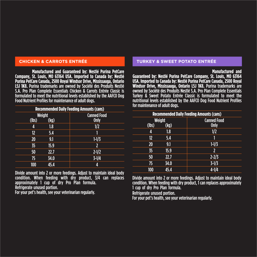 Let your dog choose between two equally delicious meal options with this Purina Pro Plan Grain Free adult wet dog food variety pack. Each recipe features real chicken or turkey as the first ingredient, and they are formulated with an optimal protein-to-fat ratio to help your dog maintain an ideal body condition. The tempting taste and moist, tender texture create a multisensory dining experience at mealtime. He gets the tastes and textures dogs love in every bowlful, along with 23 essential vitamins and minerals to help support his overall health and wellness. This premium dog food variety pack is made without artificial colors, flavors or preservatives, so your canine companion gets the important nutrition you want without the ingredients you don't. Rotate between the two wet dog food recipes found in this collection at feeding time, and give your dog the nutrition he needs to be his best every day.