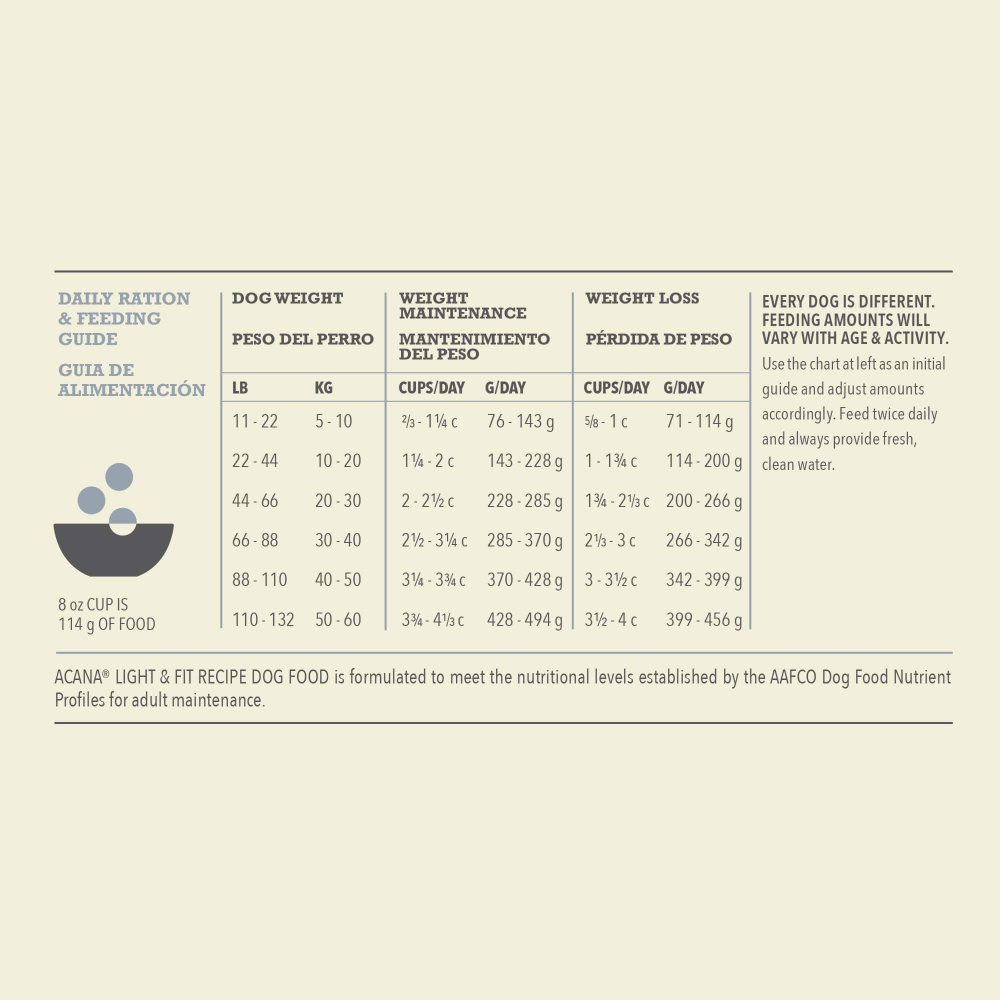 Bring home the quality nutrition your dog needs with ACANA Light & Fit Recipe Adult Dry Dog Food. This high protein dog food is a light and fit formula to support a healthy body weight and peak conditioning. Protein-rich Free-Run**** Chicken and Free-Run**** Turkey are balanced with fruits and vegetables, including pumpkin, collard greens, apples and pears, to offer complete nutrition. This ACANA dog food is 60 percent* quality animal ingredients and 40 percent** fruits and vegetables. Even better, this grain free*** dry dog food has a freeze dried coating made of chicken and turkey liver for a delicious taste your dog will love. *Approximate and derived from the unprocessed state of the ingredients **We also add vitamins, minerals, natural preservatives, flavors and probiotics ***Produced in a facility that also processes grains ****Our free-run chickens and turkeys are not housed in cages and are able to move in a barn without outdoor access.