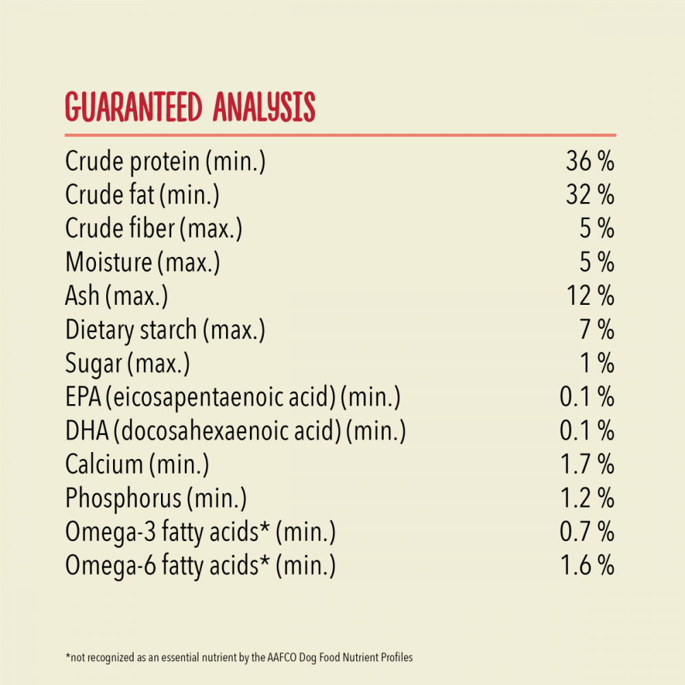 Give your dog's meals a boost of nutrition and delicious flavor with ACANA Farm-Raised Beef Recipe Freeze Dried Dog Food Meal and Topper. This grain free* freeze dried dog food satisfies your dog's natural cravings with ingredients like farm-raised beef, organs and bone. This dog food features protein-rich, bite-size breakable patties that are balanced with vegetables and fruit to provide all the benefits of raw nutrition with none of the mess. Delectable as a meal or as a topper on your dog’s favorite ACANA kibble, this freeze dried dog food topper is infused with a hearty bone broth for a taste dog's love. This dog food contains 90 percent** quality animal ingredients. Our included fresh ingredients use refrigeration as the sole method of preservation and our included raw ingredients are frozen at their peak freshness. Choose ACANA freeze dried dog food to give your companion the nutritional foundation they need to live a happy, healthy life. *Produced in a facility that also processes grains **Approximate and derived from the unprocessed state of the ingredients