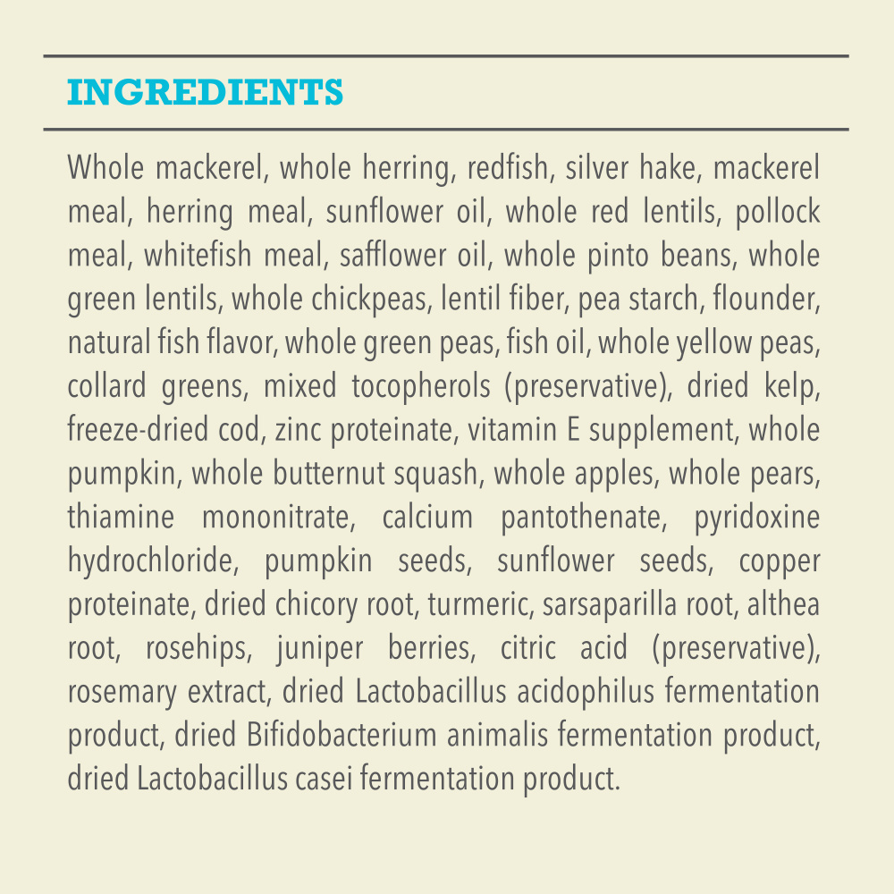 'Whole mackerel, whole herring, whole redfish, silver hake, mackerel meal, herring meal, sunflower oil, whole red lentils, pollock meal, whitefish meal, safflower oil, whole pinto beans, whole green lentils, whole chickpeas, lentil fiber, pea starch, flounder, Natural fish flavor, whole green peas, fish oil, whole yellow peas, collard greens, mixed tocopherols (preservative), dried kelp, freeze-dried cod liver, zinc proteinate, vitamin E supplement, whole pumpkin, whole butternut squash, whole carrots, whole apples, whole pears, thiamine mononitrate, calcium pantothenate, pyridoxine hydrochloride, pumpkin seeds, sunflower seeds, copper proteinate, chicory, turmeric, sarsaparilla, althea root, rosehips, juniper berries, citric acid (preservative), rosemary extract, dried Lactobacillus acidophilus fermentation product, dried Bifidobacterium animalis fermentation product, dried Lactobacillus casei fermentation product.'