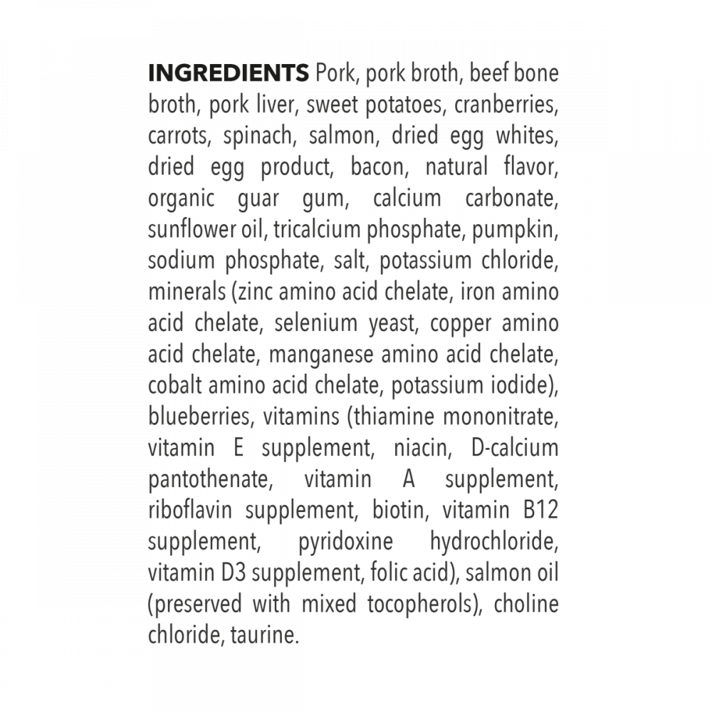 Pork, pork broth, beef bone broth, pork liver, sweet potatoes, cranberries, carrots, spinach, salmon, dried egg whites, dried egg product, bacon, Natural flavor, organic guar gum, calcium carbonate, sunflower oil, tricalcium phosphate, pumpkin, sodium phosphate, salt, potassium chloride, minerals (zinc amino acid chelate, iron amino acid chelate, selenium yeast, copper amino acid chelate, manganese amino acid chelate, cobalt amino acid chelate, potassium iodide), blueberries, vitamins (thiamine mononitrate, vitamin E supplement, niacin, D-calcium pantothenate, vitamin A supplement, riboflavin supplement, biotin, vitamin B12 supplement, pyridoxine hydrochloride, vitamin D3 supplement, folic acid), salmon oil (preserved with mixed tocopherols), choline chloride, taurine.