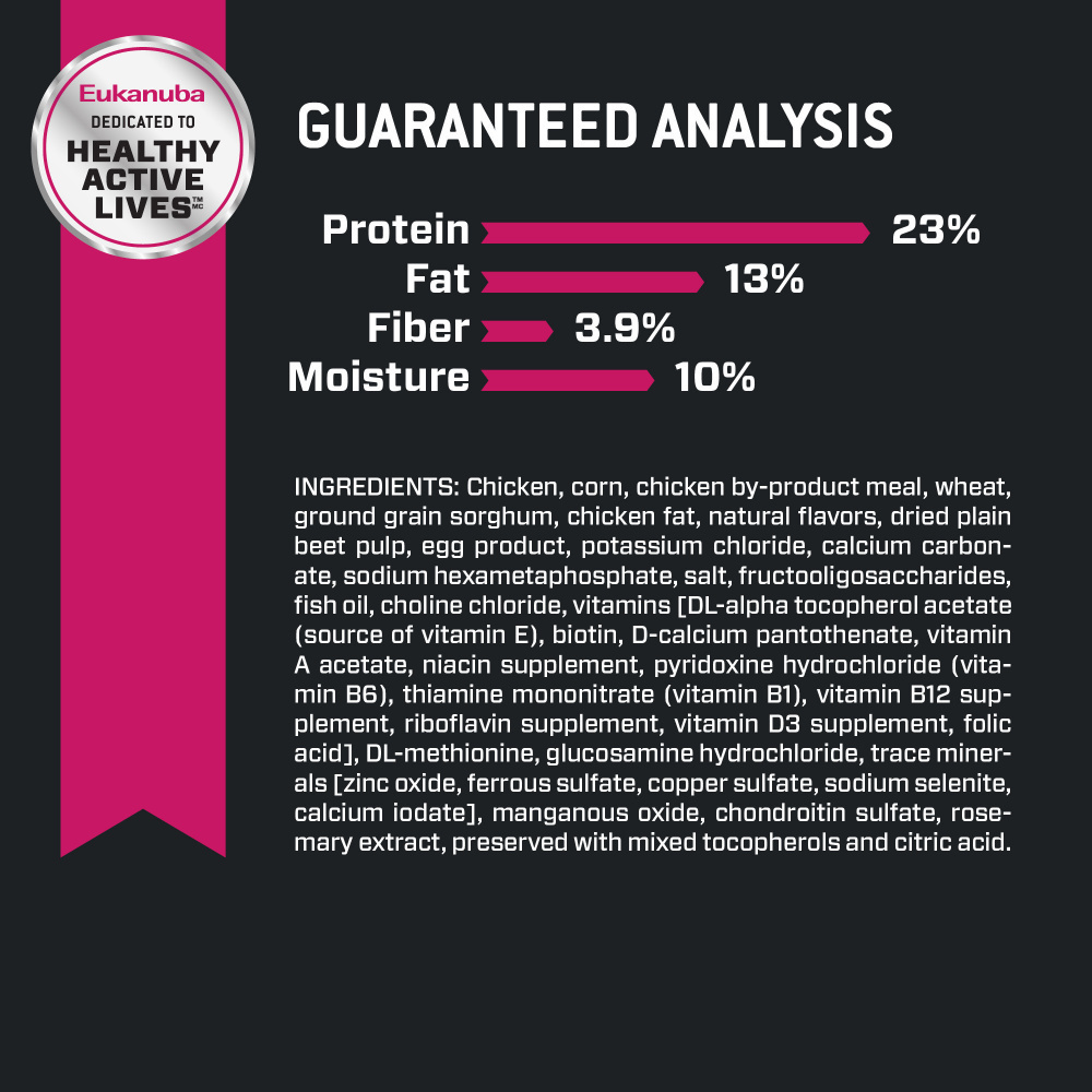Chicken, Corn Meal Ground Whole Grain Sorghum, Chicken By-Product Meal (source of Glucosamine and Chondroitin Sulfate) , Ground Whole Grain Barley, Dried Beet Pulp, Natural Flavor, Chicken Fat (preserved with Mixed Tocopherols, a source of Vitamin E), Dried Egg Product, Potassium Chloride, Fish Oil (preserved with Mixed Tocopherols, a source of Vitamin E), Salt, Flax Meal, Sodium Hexametaphosphate, Fructooligosaccharides, Calcium Carbonate, Choline Choloride, DL-Methionine, Minerals (Ferrous Sulfate, Zinc Oxide, Manganese Sulfate, Copper Sulfate, Manganous Oxide, Potassium Iodide), Vitamins (Ascorbic Acid, Vitamin A Acetate, Calcium Pantothenate, Biotin, Thiamine Mononitrate (source of Vitamin B1), Vitamin B12 Supplement, Niacin, Riboflavin Supplement (source of Vitamin B2), Inositol, Pyridoxine Hydrochloride (source of Vitamin B6), Vitamin D3 Supplement, Folic Acid), Brewers Dried Yeast, Vitamin E Supplement, L-Carnitine, Beta-Carotene, Rosemary Extract