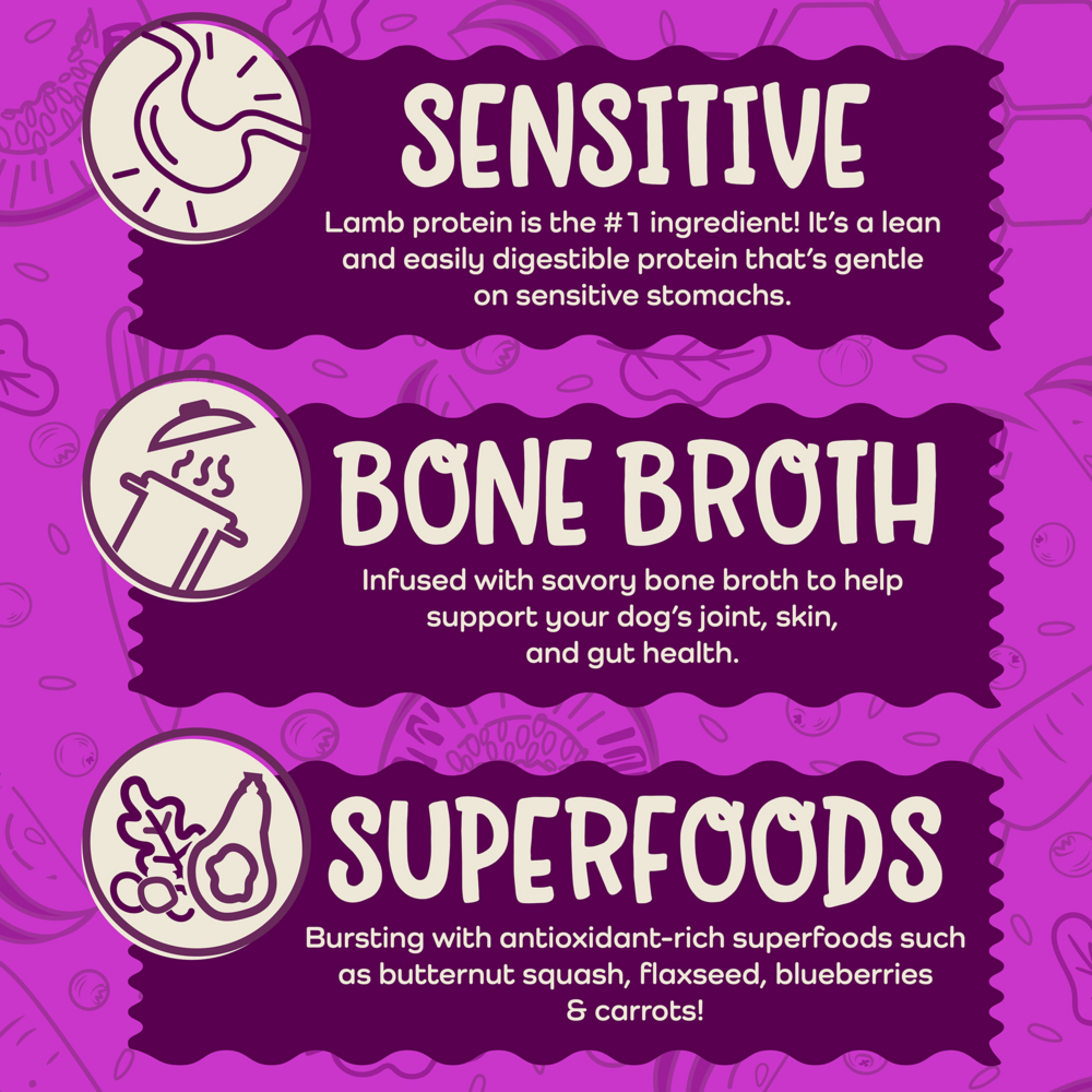 These soft and chewy lamb dog treats are the best way to add delicious to your dog’s day. Each bite of these holistic dog treats is bursting with antioxidant-rich superfoods. The lamb is a lean meat protein that is easy on those with a sensitive stomach. Bursting with antioxidant-rich superfoods such as apples and carrots. Infused with savory bone broth to support your dog’s gut, joints & skin. Grain-free, gluten-free treats made in USA kitchens.
