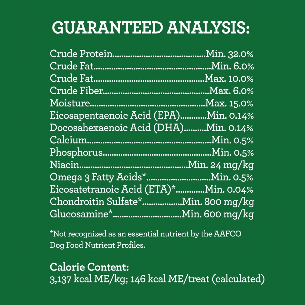 Wheat gluten, glycerin, wheat flour, gelatin, water, powdered cellulose, fish oil (preserved with mixed tocopherols), lecithin, dried chicken cartilage, minerals, (dicalcium phosphate, potassium chloride, calcium carbonate, magnesium amino acid chelate, zinc amino acid chelate, iron amino acid chelate, copper amino acid chelate, manganese amino acid chelate, selenium, potassium iodide), dried new zealand green mussel, natural poultry flavor, taurine, vitamins (l-ascorbyl-2-polyphosphate, dl-alpha tocopherol acetate [source of vitamin E], vitamin B12 supplement, d-calcium pantothenate [vitamin B5], niacin supplement, riboflavin supplement [vitamin B2], vitamin A supplement, vitamin D3 supplement, biotin, thiamine mononitrate [vitamin B1], pyridoxine hydrochloride [vitamin B6], folic acid), DL methionine, choline chloride, fruit juice color, decafffeinated green tea extract, turmeric color
