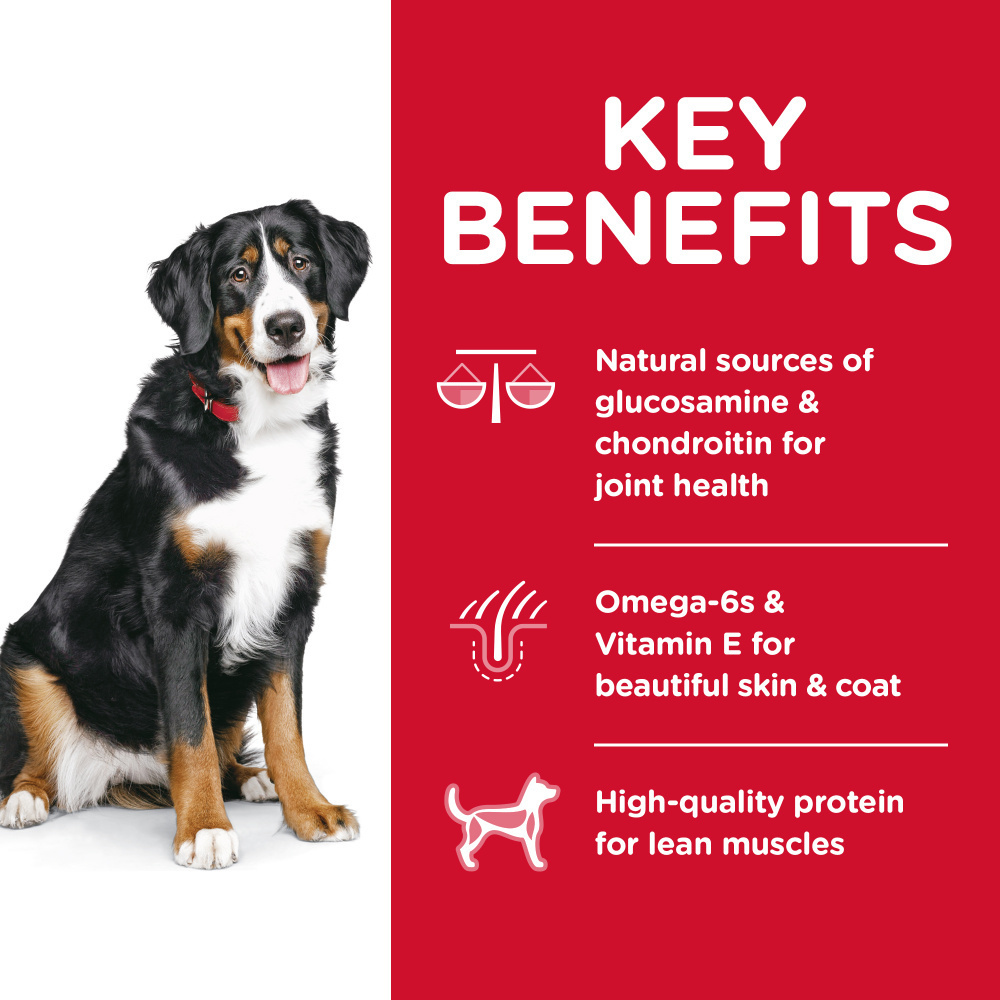 Big dogs have their own set of nutrition needs, so Hill's® Science Diet® Large Breed adult dog food is specially formulated to fuel the energy needs of large breed dogs during their prime, while offering a savory lamb flavor. Made with high-quality, easy-to digest-ingredients, this food for fully grown large dogs supports the building of lean muscle with high-quality protein, as well as glucosamine and chondroitin for healthy joints & mobility. A balanced blend of omega-6s and vitamin E nourishes your dog's skin for a healthy, shiny coat. There’s more to love with the new look of Science Diet®. Some of our products also have new names, new kibble shapes & new formulas.? Adult dry dog food is specially formulated to fuel the energy needs of large breed dogs ? Supports your grown dog's joint health with natural sources of glucosamine & chondroitin ? Maintain your dog's healthy skin and shiny coat with nourishing omega-6 fatty acids & vitamin E ? Promotes lean muscle in large dogs with high-quality protein ? Irresistible lamb flavor for those who love varietyA delicious complement to the nutrition of Science Diet dry dog food