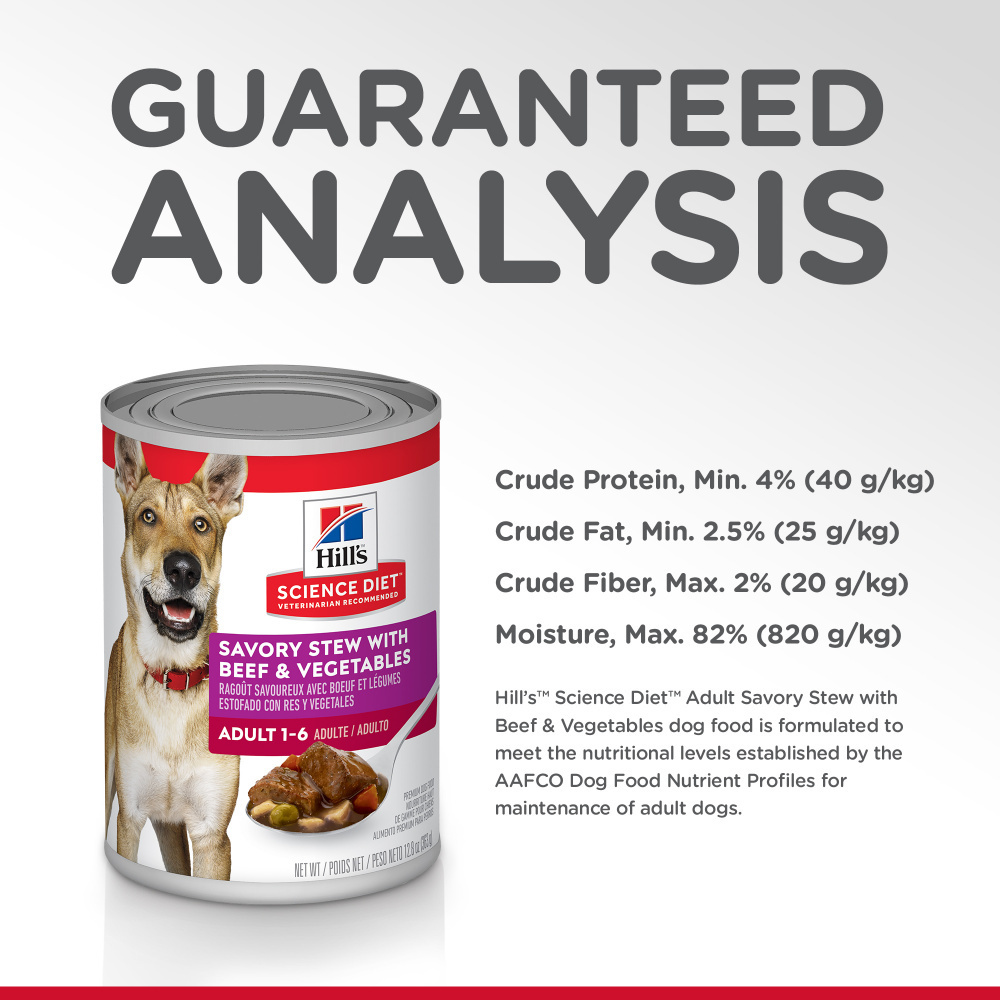 Send your adult dog running to the bowl with a recipe that supports their prime years. Hill's Science Diet Adult Savory Stew with Beef & Vegetables is a delicious way to provide precisely balanced nutrition that enhances the overall health and wellbeing of your pet. This dog food made with natural ingredients blends real meat, brown rice, and a medley of delectable vegetables including peas and carrots, all smothered in a delicious gravy grown dogs love. The precise balance of key nutrients provides dogs 1–6 years old with quality protein for lean muscles. If you want to keep your doggy happy during the prime years, this recipe is one to try. There’s more to love with the new look of Science Diet®. Some of our products also have new names, new kibble shapes & new formulas.• High-quality protein to help your adult dog build and maintain lean muscles • Made with purposeful, easily digestible ingredients grown dogs enjoy • Mix up meal time with Hill's Science Diet Adult Savory Stew with Chicken & Vegetables• Made with natural ingredients • #1 Veterinarian Recommended A delicious complement to the nutrition of Science Diet dry dog food