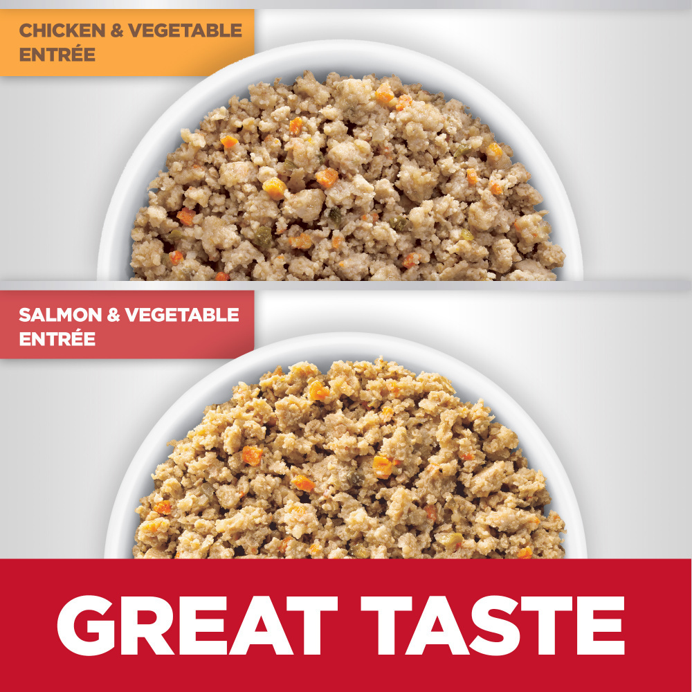 *Salmon & Vegetable Entrée: Chicken Broth, Salmon, Carrots, Turkey, Potatoes, Green Beans, Potato Starch, Pea Protein, Sugar, Egg Whites, Chicken Fat, Dried Whey, Dried Beet Pulp, Soybean Oil, Chicken Liver Flavor, Carrageenan, Dicalcium Phosphate, Choline Chloride, Iodized Salt, Dried Apple Pomace, vitamins (Vitamin E Supplement, Ascorbic Acid (source of Vitamin C), Thiamine Mononitrate, Niacin Supplement, Menadione Sodium Bisulfite Complex (source of Vitamin K), Pyridoxine Hydrochloride, Calcium Pantothenate, Vitamin B12 Supplement, Riboflavin Supplement, Vitamin A Supplement, Biotin, Folic Acid), Taurine, minerals (Zinc Oxide, Ferrous Sulfate, Copper Sulfate, Manganese Sulfate, Manganous Oxide, Calcium Iodate).*Chicken & Vegetable Entrée: Chicken Broth, Chicken, Turkey Giblets, Green Beans, Carrots, Green Peas, Potato Starch, Egg Whites, Oat Fiber, Powdered Cellulose, Dried Tomato Pomace, Dried Beet Pulp, Pea Protein, Flaxseed, Coconut Oil, Chicken Liver Flavor, Dicalcium Phosphate, Carrageenan, Choline Chloride, Iodized Salt, DL-Methionine, Dried Apple Pomace, vitamins (Vitamin E Supplement, Ascorbic Acid (source of Vitamin C), L-Ascorbyl-2-Polyphosphate (source of Vitamin C), Thiamine Mononitrate, Niacin Supplement, Vitamin A Supplement, Calcium Pantothenate, Pyridoxine Hydrochloride, Vitamin B12 Supplement, Riboflavin Supplement, Biotin, Vitamin D3 Supplement, Menadione Sodium Bisulfite Complex (source of Vitamin K), Folic Acid), Potassium Chloride, L-Lysine, Calcium Carbonate, Taurine, minerals (Ferrous Sulfate, Zinc Oxide, Copper Sulfate, Manganese Sulfate, Calcium Iodate), L-Carnitine, Beta-Carotene.