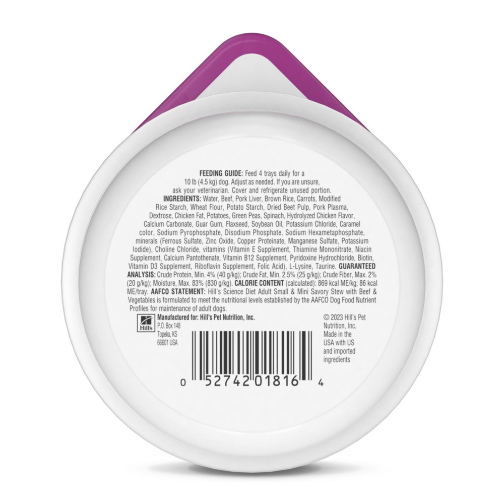 Give your little dog the nutrition they need, with a yummy flavor they can't resist, in a convenient single-serve tray. Hill's Science Diet Adult Small & Mini Savory Stew with Beef & Vegetables is a precisely balanced recipe made for small and toy breed dogs. With high-quality protein for muscle maintenance and an easy-to-digest formula, this premium dog food made with natural ingredients enhances the overall health and wellbeing of your little canine with real meat, brown rice, and a medley of delectable vegetables all smothered in tasty gravy. There’s more to love with the new look of Science Diet. Some of our products also have new names & new formulas.