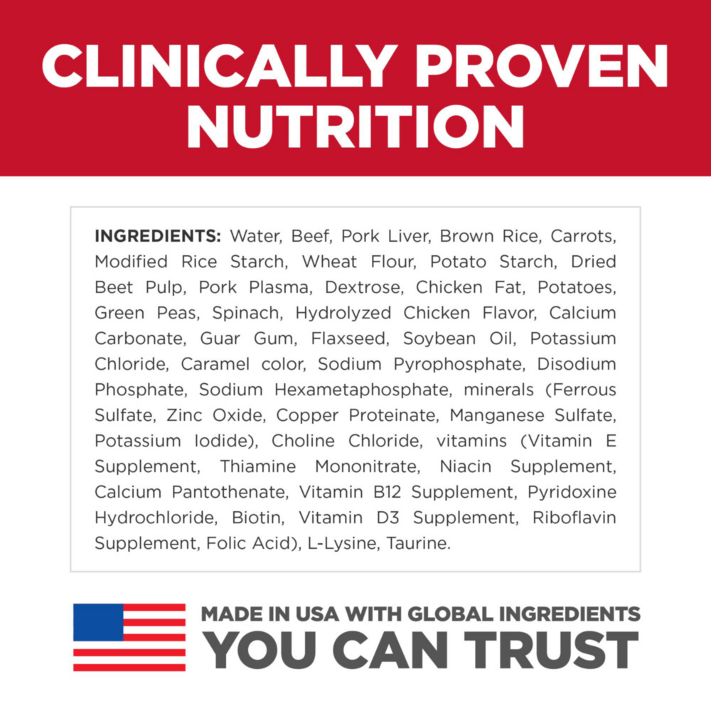 Water, Beef, Pork Liver, Brown Rice, Carrots, Modified Rice Starch, Wheat Flour, Potato Starch, Dried Beet Pulp, Pork Plasma, Dextrose, Chicken Fat, Potatoes, Green Peas, Spinach, Hydrolyzed Chicken Flavor, Calcium Carbonate, Guar Gum, Flaxseed, Soybean Oil, Potassium Chloride, Caramel color, Sodium Pyrophosphate, Disodium Phosphate, Sodium Hexametaphosphate, minerals (Ferrous Sulfate, Zinc Oxide, Copper Proteinate, Manganese Sulfate, Potassium Iodide), Choline Chloride, vitamins (Vitamin E Supplement, Thiamine Mononitrate, Niacin Supplement, Calcium Pantothenate, Vitamin B12 Supplement, Pyridoxine Hydrochloride, Biotin, Vitamin D3 Supplement, Riboflavin Supplement, Folic Acid), L-Lysine, Taurine.NutrientGA MinGA MaxAs FedDry MatterCaloric BasisProtein4 %5.4 %27.1 %6.2 g / 100 kcalFat4.3 %21.3 %4.9 g / 100 kcalCarbohydrate / NFE8.6 %43 %9.9 g / 100 kcalCrude Fiber2 %0.4 %2.1 %0.5 g / 100 kcalCalcium0.19 %0.94 %216 mg / 100 kcalPhosphorus0.13 %0.65 %149 mg / 100 kcalPotassium0.17 %0.85 %197 mg / 100 kcalSodium0.12 %0.58 %133 mg / 100 kcalMagnesium0.014 %0.069 %16 mg / 100 kcalVitamin C1 ppm6 ppm0.14 mg / 100 kcalVitamin E71 IU/kg355 IU/kg8.17 IU / 100 kcal>20C Omega-3 FA0.01 %0.05 %12 mg / 100 kcal>20C Omega-6 FA0.06 %0.31 %71 mg / 100 kcal