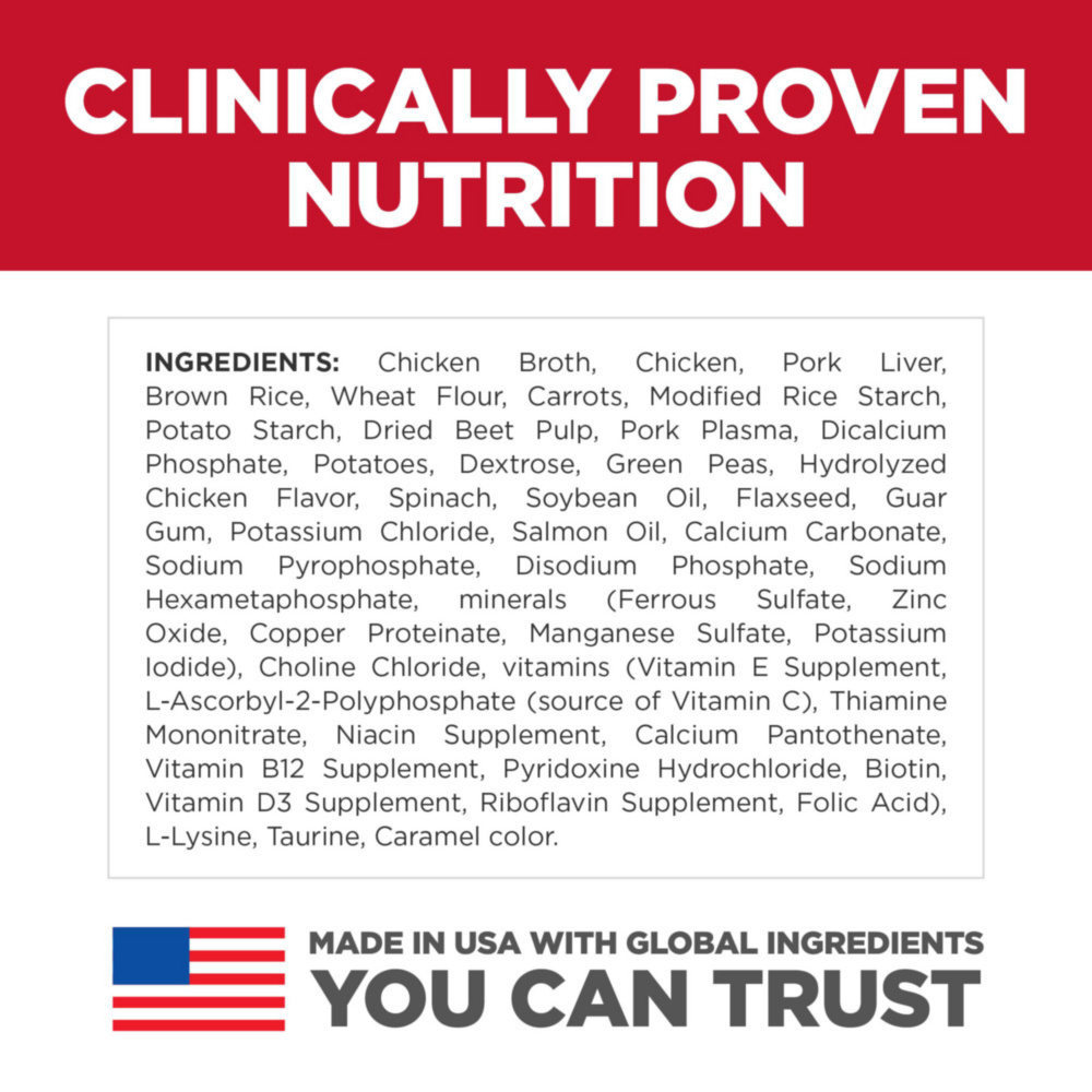 Chicken Broth, Chicken, Pork Liver, Brown Rice, Wheat Flour, Carrots, Modified Rice Starch, Potato Starch, Dried Beet Pulp, Pork Plasma, Dicalcium Phosphate, Potatoes, Dextrose, Green Peas, Hydrolyzed Chicken Flavor, Spinach, Soybean Oil, Flaxseed, Guar Gum, Potassium Chloride, Salmon Oil, Calcium Carbonate, Sodium Pyrophosphate, Disodium Phosphate, Sodium Hexametaphosphate, minerals (Ferrous Sulfate, Zinc Oxide, Copper Proteinate, Manganese Sulfate, Potassium Iodide), Choline Chloride, vitamins (Vitamin E Supplement, L-Ascorbyl-2-Polyphosphate (source of Vitamin C), Thiamine Mononitrate, Niacin Supplement, Calcium Pantothenate, Vitamin B12 Supplement, Pyridoxine Hydrochloride, Biotin, Vitamin D3 Supplement, Riboflavin Supplement, Folic Acid), L-Lysine, Taurine, Caramel color.NutrientGA MinGA MaxAs FedDry MatterCaloric BasisProtein5.5 %6.8 %30.7 %7.4 g / 100 kcalFat3 %4 %18.1 %4.4 g / 100 kcalCarbohydrate / NFE8.8 %40.1 %9.7 g / 100 kcalCrude Fiber1.5 %0.4 %1.8 %0.4 g / 100 kcalCalcium0.37 %1.69 %407 mg / 100 kcalPhosphorus0.34 %1.53 %368 mg / 100 kcalPotassium0.18 %0.84 %203 mg / 100 kcalSodium0.13 %0.59 %143 mg / 100 kcalMagnesium0.017 %0.075 %18 mg / 100 kcalVitamin C49 ppm223 ppm5.38 mg / 100 kcalVitamin E183 IU/kg832 IU/kg20.08 IU / 100 kcalDHA0.002 %0.008 %1.9 mg / 100 kcal>20C Omega-3 FA0.01 %0.02 %6 mg / 100 kcal>20C Omega-6 FA0.03 %0.14 %34 mg / 100 kcal