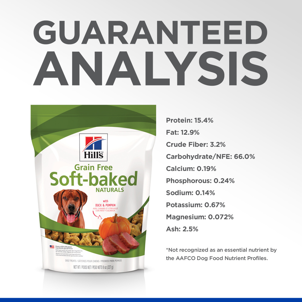 Hill's Soft-Baked Naturals with Duck & Pumpkin are delicious, natural dog treats with real duck to help maintain lean muscle. Grain free with no corn, wheat, soy, added artificial preservatives, colors or flavors. • Indulge your dog with a delicious, natural treat made with real duck and pumpkin.