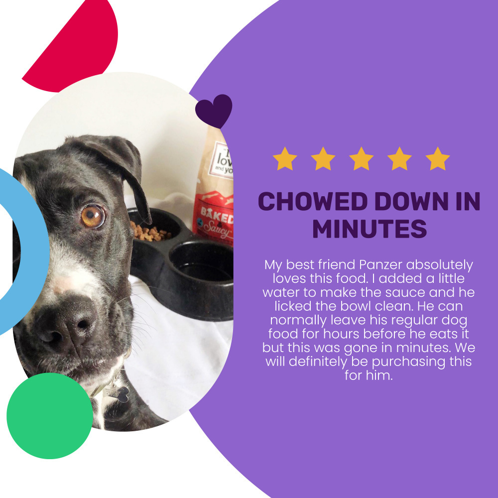 'Instead of slow cooking a savory beef tenderloin for your pet tonight (cause who has the time?), surprise your dog with a mouthwatering, rich, 2-in-1 decadent meal! Oven baked in smaller batches, this heart-shaped kibble is coated in savory bone broth and made with beef and nutritious sweet potato. Surprise your pup by adding a little bit of water to create an oh-so-saucy effect so they can enjoy every last lick of the bowl!