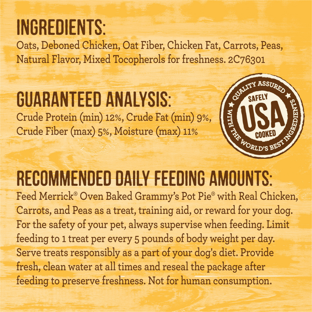 At Merrick, we make the best treats ever for your best dog ever. Our Oven Baked biscuits are inspired by home-made recipes using ingredients you could find in your own kitchen. With only 7, real, natural ingredients, you’ll feel good about treating your best friend to something delicious. Just as you would in your own home, these biscuits are hand-crafted and slowly baked for a tasty crunch. As with all of our products, these Oven Baked treats are made in the good old US of A and are free of corn, wheat, soy and artificial ingredients.Oven Baked and hand crafted in small batches for a great smell and taste- Real whole foods like deboned chicken, deboned beef, and real peanut butter- Only 7 ingredients (or less) in each recipe- Natural ingredients you could find in your own kitchen.- No corn, wheat, or soy and no artificial colors, flavors, preservatives or by-products