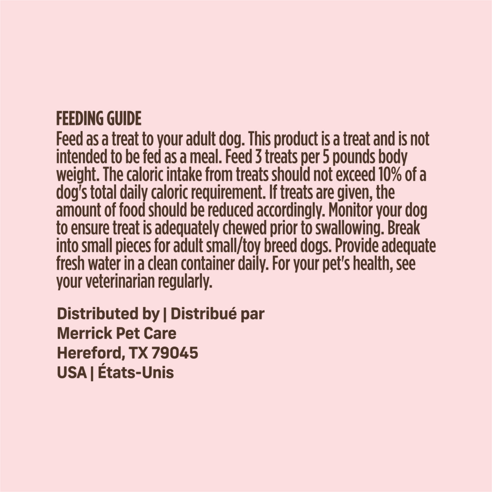 Merrick Power Bites are soft and chewy all-natural treats, with big taste and industry-leading levels of powerful protein packed into every bite. These treats are perfect for training and rewarding dogs. Power Bites start with real deboned meat as the #1 ingredient, with added nutrition from fresh fruits and vegetables. Power Bites are grain-free and gluten-free, without sorbic acid.