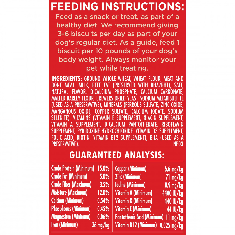 Wheat flour, wheat bran, beef meal and beef bone meal, beef fat preserved with tocopherols, wheat germ, poultry by-product meal, dried vegetable pomace, salt, lamb meal, chicken meal, turkey meal, minerals (dicalcium phosphate, iron oxide, zinc sulfate, calcium carbonate, copper sulfate, ethylenediamine dihydriodide (source of iodine)), artificial color (includes yellow 5, red 40, blue 1), brewers dried yeast, malted barley flour, vitamins (choline chloride, dl-alpha tocopheryl acetate (vitamin E), vitamin A acetate, calcium pantothenate, riboflavin, vitamin B12 supplement, d-activated animal sterol (source of vitamin D3)), sodium metabisulfite (dough conditioner), whey casein (a milk protein).Guaranteed Analysis