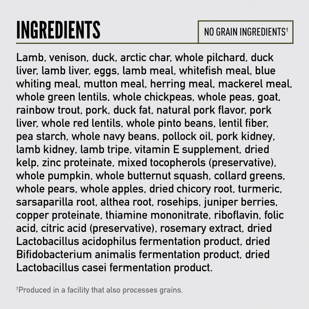 Lamb, venison, duck, arctic char, rainbow tout, lamb meal, pollock meal, sardine meal, herring meal, mackerel meal, whole red lentils, whole pinto beans, pork, pork fat, duck liver, natural pork flavor, pork liver, lamb liver, whole herring, pollock oil, whole navy beans, whole green lentils, whole chickpeas, whole peas, dried apple pomace, duck meal, lamb tripe, pork kidney, dried kelp, vitamin E supplement, zinc proteinate, whole butternut squash, whole pumpkin, mixed tocopherols (preservative), collard greens, whole pears, whole apples, niacin, thiamine mononitrate, calcium pantothenate, pyridoxine hydrochloride, riboflavin, folic acid, vitamin B12 supplement, copper proteinate, dried Bacillus coagulans fermentation product, dried chicory root, turmeric, sarsaparilla root, althea root, rosehips, juniper berries, citric acid (preservative), rosemary extract.
