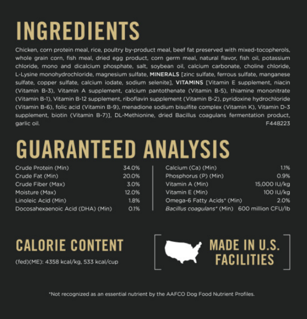 Chicken, corn gluten meal, rice, poultry by-product meal, beef fat preserved with mixedtocopherols, whole grain corn, fish meal, dried egg product, corn germ meal, natural flavor, fish oil,potassium chloride, salt, soybean oil, calcium carbonate, mono and dicalcium phosphate, cholinechloride, L-Lysine monohydrochloride, magnesium sulfate, MINERALS [zinc sulfate, ferrous sulfate,manganese sulfate, copper sulfate, calcium iodate, sodium selenite], VITAMINS [Vitamin E supplement,niacin (Vitamin B-3), Vitamin A supplement, calcium pantothenate (Vitamin B-5), thiamine mononitrate(Vitamin B-1), Vitamin B-12 supplement, riboflavin supplement (Vitamin B-2), pyridoxine hydrochloride(Vitamin B-6), folic acid (Vitamin B-9), menadione sodium bisulfite complex (Vitamin K), Vitamin D-3supplement, biotin (Vitamin B-7)], DL-Methionine, dried Bacillus coagulans fermentation product, garlicoil
