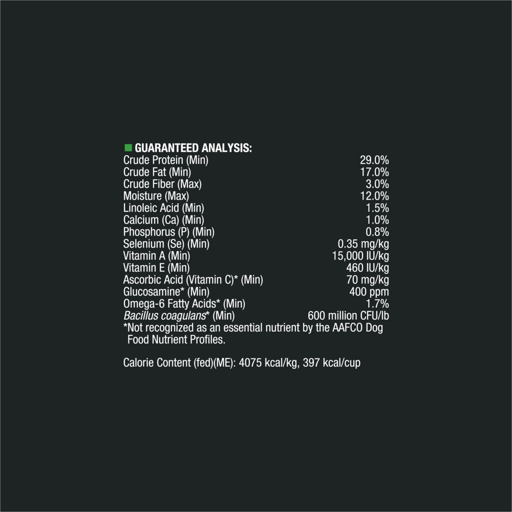 Chicken, rice, poultry by-product meal, beef fat preserved with mixed-tocopherols, corngluten meal, soybean meal, whole grain corn, whole grain wheat, corn germ meal, dried egg product,natural flavor, dried yeast, glycerin, calcium carbonate, wheat bran, fish meal, salt, mono and dicalciumphosphate, potassium chloride, MINERALS [zinc proteinate, manganese proteinate, ferrous sulfate,copper proteinate, calcium iodate, sodium selenite], VITAMINS [Vitamin E supplement, niacin (Vitamin B3), Vitamin A supplement, calcium pantothenate (Vitamin B-5), thiamine mononitrate (Vitamin B-1),Vitamin B-12 supplement, riboflavin supplement (Vitamin B-2), pyridoxine hydrochloride (Vitamin B-6),folic acid (Vitamin B-9), Vitamin D-3 supplement, menadione sodium bisulfite complex (Vitamin K), biotin(Vitamin B-7)], choline chloride, L-Lysine monohydrochloride, L-ascorbyl-2-polyphosphate (Vitamin C),dried Bacillus coagulans fermentation product, garlic oil.