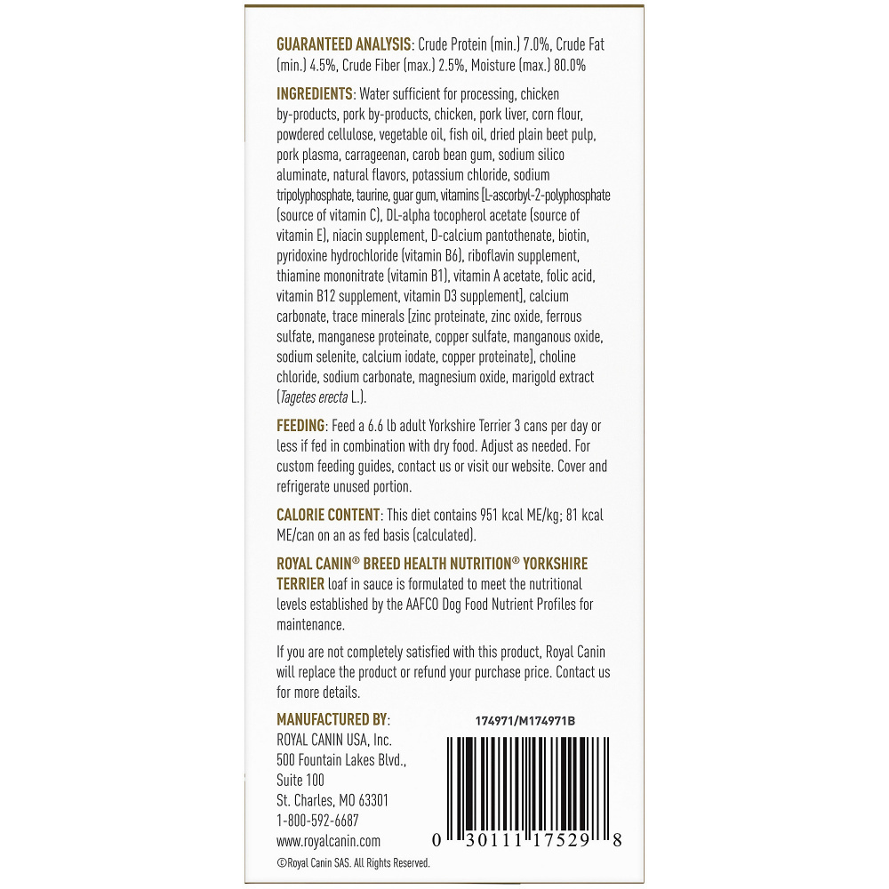 Royal Canin knows what makes your Yorkshire Terrier magnificent is in the details. Although they have big dog personalities, Yorkies have delicate little bodies with long, silky coats that require special care. These portable pooches can benefit from precise nutrition from a food that’s easy to eat, keeps their long coats shiny and soft, and appeases their finicky appetites. Royal Canin Yorkshire Terrier Adult Loaf in Sauce wet dog food is tailor-made nutrition created just for your pure breed Yorkie. This exclusive breed-specific diet is uniquely formulated for your small breed Yorkshire Terrier with specific nutrients to help them thrive. The complete, balanced, and aromatic soft dog food features a highly palatable paté to appeal to your Yorkshire Terrier’s appetite with moderately high fat and energy density. Optimal levels of omega-3 and omega-6 fatty acids, plus biotin, help give your Yorkshire Terrier’s long coat a beautiful shine. And a blend of soluble and insoluble fibers support healthy digestion. Mix in or complement with Royal Canin Yorkshire Terrier Adult dry dog food for extra encouragement when it comes to fussy eaters. With nearly 50 years of scientific research and observation, Royal Canin continues to deliver targeted nutrition to feed every pet’s magnificence. Not satisfied? Then neither are we. Our breed health formulas are 100% satisfaction guaranteed. (Just contact us for more details.Royal Canin Yorkshire Terrier Adult wet dog food is designed to meet the nutritional needs of purebred Yorkshire Terriers 10 months and olderSoft dog food featuring Loaf in Sauce for a paté that appeals to a Yorkie’s appetiteMaintains a Yorkshire Terrier’s glossy, long hair with a combination of omega-3 fatty acids, omega-6 fatty acids, and biotinSupports healthy intestinal transit with soluble and insoluble fibersComplete and balanced canned dog food can be fed alone or mixed with Royal Canin Yorkshire Terrier Adult dry dog food