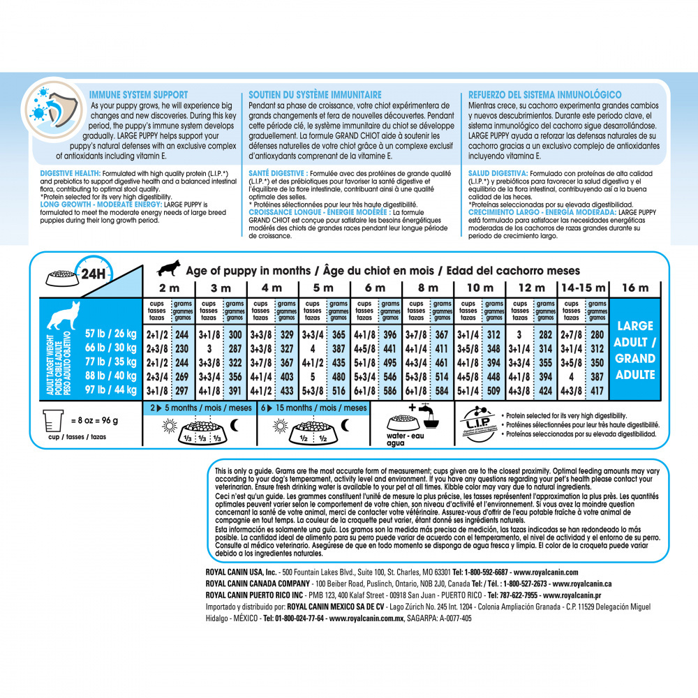 With countless dog food options out there with formulas focused on ingredients, how do you know what’s right for your growing puppy? No matter how big or small your pup becomes, Royal Canin has a right-sized diet, made with the precise amount of nutrients needed for every stage of their magnificent future.Your large breed puppy has big nutritional needs. That’s because large dogs have a longer growth period than smaller ones. As they grow, they can multiply their birth weight by an impressive 70 to 90 times! Then later, as adults, large breed dogs are more at risk of developing bone and joint issues. That’s why they need optimum nutrition early on, to develop strong muscles and bones that will support their large bodies throughout their lives. Royal Canin Large Puppy dry dog food is wholesome puppy food that gives your big pup a healthy start in life. This complete and balanced diet helps build strong bones and joints, while an exclusive blend of antioxidants and minerals supports their developing immune systems and keeps their bodies growing strong. Its exclusive kibble design encourages your pup to chew their food thoroughly. And highly digestible proteins and prebiotics help your dog break down and absorb nutrients for healthy digestion and optimal stools.With nearly 50 years of scientific research and observation, Royal Canin continues to deliver targeted nutrition to feed every pet’s magnificence. Not satisfied? Then neither are we. Our formulas are 100% satisfaction guaranteed.