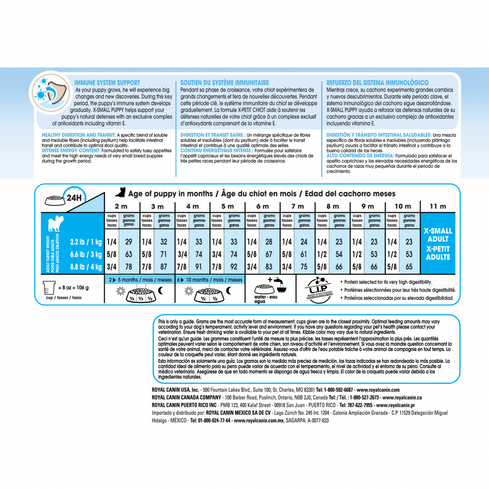 With countless dog food options out there with formulas focused on ingredients, how do you know what’s right for your growing puppy? No matter how big or small your pup becomes, Royal Canin has a right-sized diet, made with the precise amount of nutrients needed for every stage of their magnificent future.Your extra-small puppy has some big nutritional needs. That’s because toy and miniature breed puppies grow over a shorter period of time at a more intense rate than any other size dog. They’re also pretty fussy when it comes to the food they eat—it’s important to find a wholesome puppy food they’ll love. Royal Canin has the diet for extra-small puppies down to a science, finding the exact balance of nutrients your tiny puppy needs to become one magnificent dog.Royal Canin X-Small Puppy dry dog food is tailor-made for your mini pup’s healthy growth and development. It has all the proteins, minerals, and vitamins your new puppy needs to sustain the intense growth period that happens over the first 10 months of their life. An exclusive mix of antioxidants and minerals supports their developing immune systems and keeps their bodies growing strong. A small and tasty kibble designed for your pup’s smaller teeth and picky appetite also reduces the formation of tartar. And a tailored blend of fiber helps aid in digestion for optimal stool quality.With nearly 50 years of scientific research and observation, Royal Canin continues to deliver targeted nutrition to feed every pet’s magnificence. Not satisfied? Then neither are we. Our formulas are 100% satisfaction guaranteed.