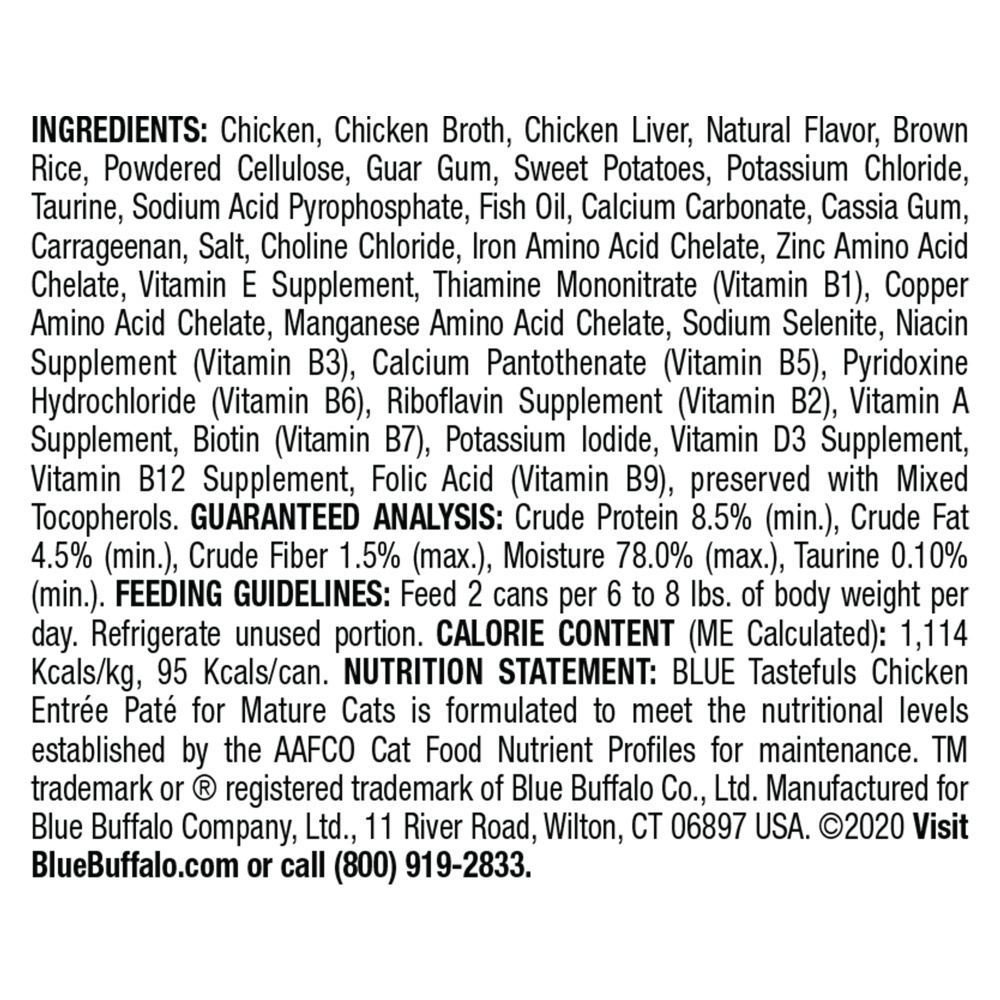 BLUE Tastefuls silky-smooth paté for senior cats starts with real chicken as the first ingredient, plus wholesome brown rice and sweet potatoes. Made from the finest natural ingredients enhanced with vitamins, minerals and other nutrients, this canned food recipe supports your older cat?s need to stay active. Tastefuls has the great taste cats want with the healthy ingredients you prefer feeding. Let your cat try this mouthwatering wet cat food to see why one taste is all it takes!