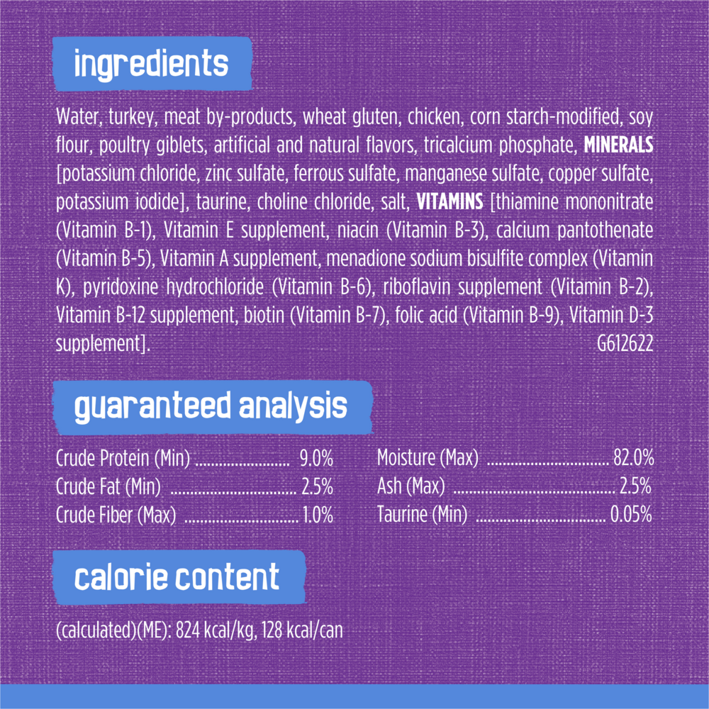 Water, Turkey, Meat By-Products, Wheat Gluten, Chicken, Corn Starch-Modified, Soy Flour, Poultry Giblets, Artificial And Natural Flavors, Tricalcium Phosphate, Minerals [Potassium Chloride, Zinc Sulfate, Ferrous Sulfate, Manganese Sulfate, Copper Sulfate, Potassium Iodide], Taurine, Choline Chloride, Added Color, Salt, Vitamins [Thiamine Mononitrate (Vitamin B-1), Vitamin E Supplement, Niacin (Vitamin B-3), Calcium Pantothenate (Vitamin B-5), Vitamin A Supplement, Menadione Sodium Bisulfite Complex (Vitamin K), Pyridoxine Hydrochloride (Vitamin B-6), Riboflavin Supplement (Vitamin B-2), Vitamin B-12 Supplement, Biotin (Vitamin B-7), Folic Acid (Vitamin B-9), Vitamin D-3 Supplement], Xanthan Gum.