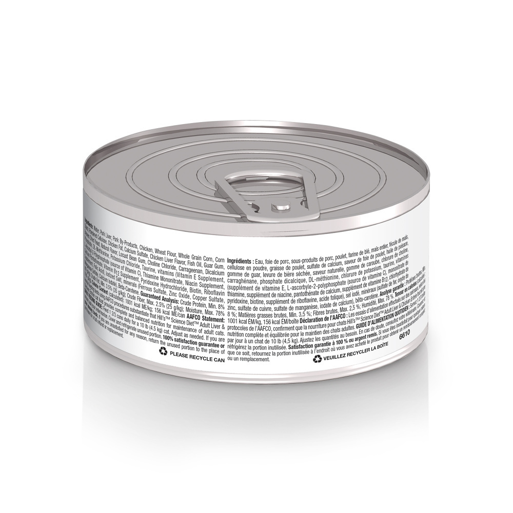 Made with purposeful ingredients for a flavorful, nutritious meal, Science Diet Adult Liver & Chicken Entree canned cat food brings together two tempting flavors into a smooth, easy-to-digest wet food. Formulated for the developmental needs of grown felines, this cat food made with natural ingredients provides high-quality protein for muscle maintenance. Give your adult cat the perfect balance of taste and nutrition with this smooth canned food packed with antioxidants plus vitamins C+E. There’s more to love with the new look of Science Diet®. Some of our products also have new names, new kibble shapes & new formulas. • High-quality protein to help your adult cat maintain lean muscle • Made with purposeful, easily digestible ingredients grown cats enjoy • Supports your grown cat's immunity with clinically proven antioxidants and vitamins C+E • Mix up your kitty's meal time by trying our other yummy minced flavors • Mouthwatering wet food made with natural ingredients • #1 Veterinarian Recommended Precisely balanced nutrition with the delicious taste of minced liver & chicken to help fuel the energy needs of cats during the prime of their life.