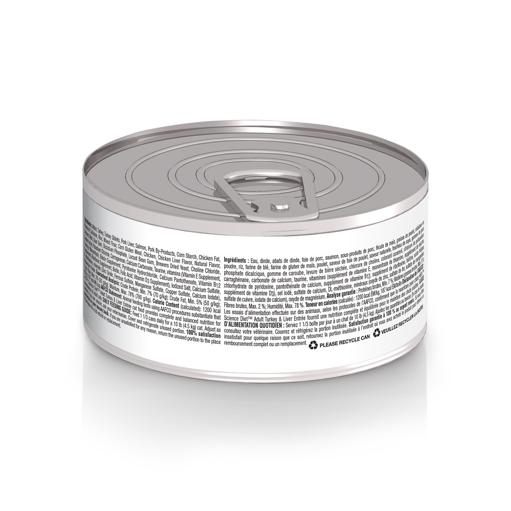 Made with purposeful ingredients for a flavorful, nutritious meal, Hill's Science Diet Adult Turkey & Liver Entree wet food uses high-quality ingredients to ensure availability of key nutrients and proteins for your adult cat. Formulated for the needs of grown felines, this cat food made with natural ingredients provides high-quality protein for muscle maintenance. Give your grown cat the perfect balance of taste and nutrition with this smooth canned food packed with antioxidants plus vitamins C+E. There’s more to love with the new look of Science Diet®. Some of our products also have new names, new kibble shapes & new formulas. • High-quality protein to help your adult cat maintain lean muscle • Made with purposeful, easily digestible ingredients grown cats enjoy • Delicious canned food with antioxidants plus vitamins C+E for feline immune support • Mix up your kitty's meal time by trying our other yummy minced flavors • Made with natural ingredients • #1 Veterinarian Recommended Precisely balanced nutrition with the delicious taste of minced turkey & liver to help fuel the energy needs of cats during the prime of their life.