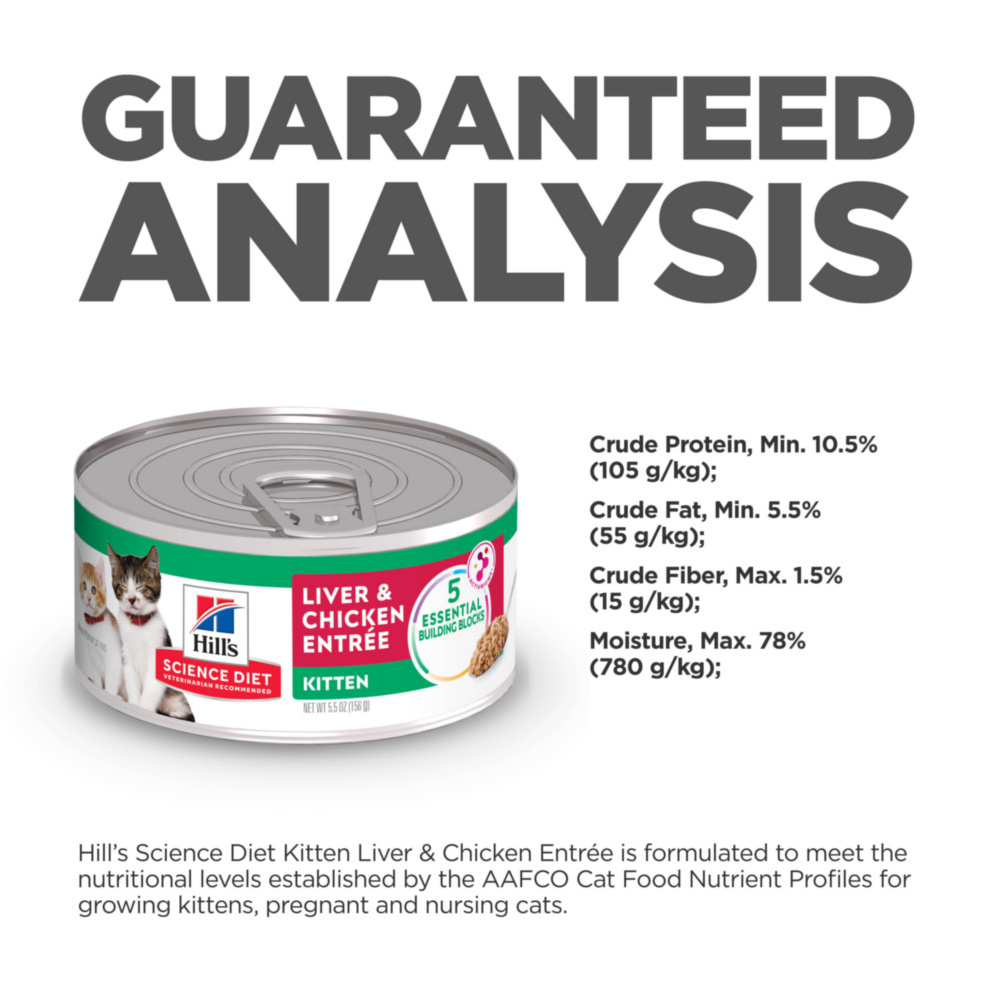 Your little kitten needs premium pet nutrition that can keep up with their active lifestyle. That's why Hill's Science Diet Kitten Liver & Chicken Entree wet food uses high-quality ingredients to ensure availability of key nutrients and proteins for your young cat. Carefully formulated for the developmental needs of kittens, this cat food made with natural ingredients provides high-quality protein that will support a kitten's muscle growth and development. Balanced minerals promote strong bones and strong teeth, to keep your kitten healthy well throughout the first year of life. There’s more to love with the new look of Science Diet®. Some of our products also have new names, new kibble shapes & new formulas.• High-quality protein to help your kitten build and maintain lean muscle • Made with purposeful, easily digestible ingredients young cats enjoy • Contains a clinically proven antioxidant blend, plus vitamins C+E for your developing kitten's immune support • Canned food with balanced minerals for strong bones and healthy teeth • Try all three flavors to give your furry feline the variety they crave Made with natural ingredients