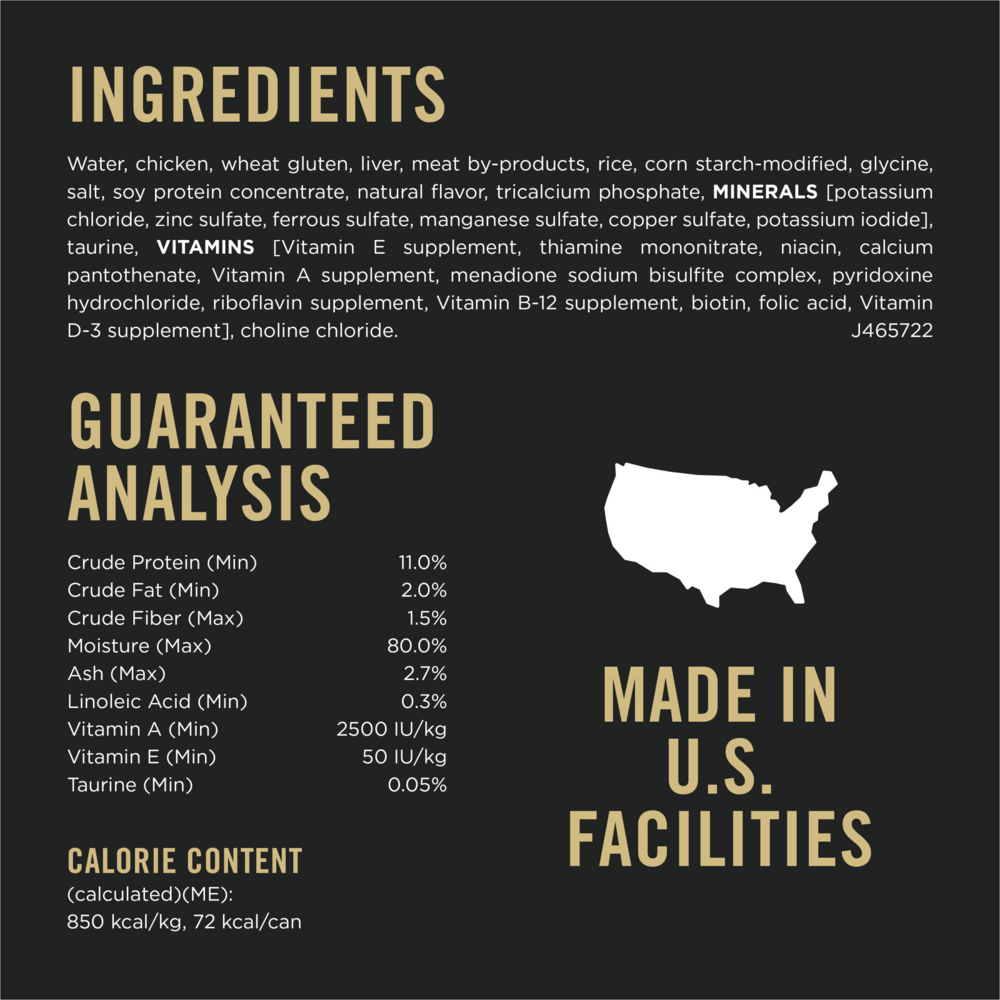 Water Sufficient for Processing, Chicken, Liver, Wheat Gluten, Meat By-Products, Rice, Soy Flour, Corn Starch-Modified, Artificial and Natural Flavors, Salt, Tricalcium Phosphate, Potassium Chloride, Added Color, Taurine, Choline Chloride, Vitamin E Supplement, Thiamine Mononitrate, Zinc Sulfate, Niacin, Ferrous Sulfate, Calcium Pantothenate, Vitamin A Supplement, Menadione Sodium Bisulfite Complex (Vitamin K), Pyridoxine Hydrochloride, Copper Sulfate, Manganese Sulfate, Riboflavin Supplement, Vitamin B-12 Supplement, Biotin, Folic Acid, Vitamin D-3 Supplement, Potassium Iodide. A-4657-5.5.