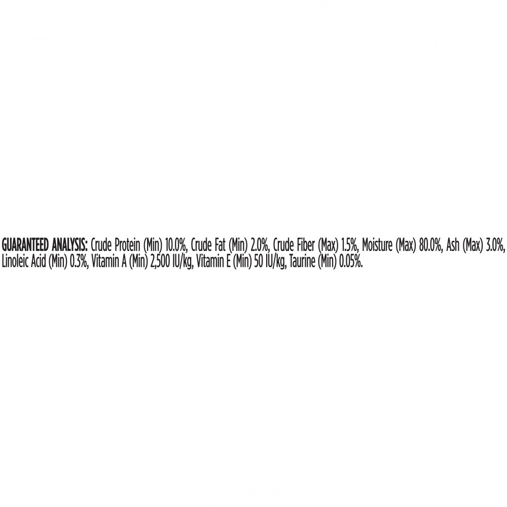 Water sufficient for processing, ocean fish, wheat gluten, liver, chicken, meat by-products, tomatoes, carrots, corn starch-modified, artificial and natural flavors, shrimp, soy flour, salt, tricalcium phosphate, added color, potassium chloride, taurine, choline chloride, Vitamin E supplement, thiamine mononitrate, zinc sulfate, ferrous sulfate, niacin, calcium pantothenate, Vitamin A supplement, menadione sodium bisulfite complex (source of Vitamin K activity), copper sulfate, manganese sulfate, pyridoxine hydrochloride, riboflavin supplement, Vitamin B-12 supplement, biotin, folic acid, Vitamin D-3 supplement, and potassium iodide