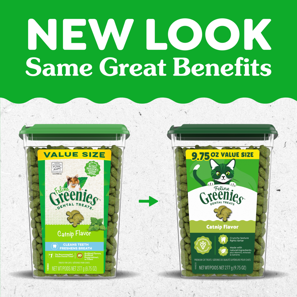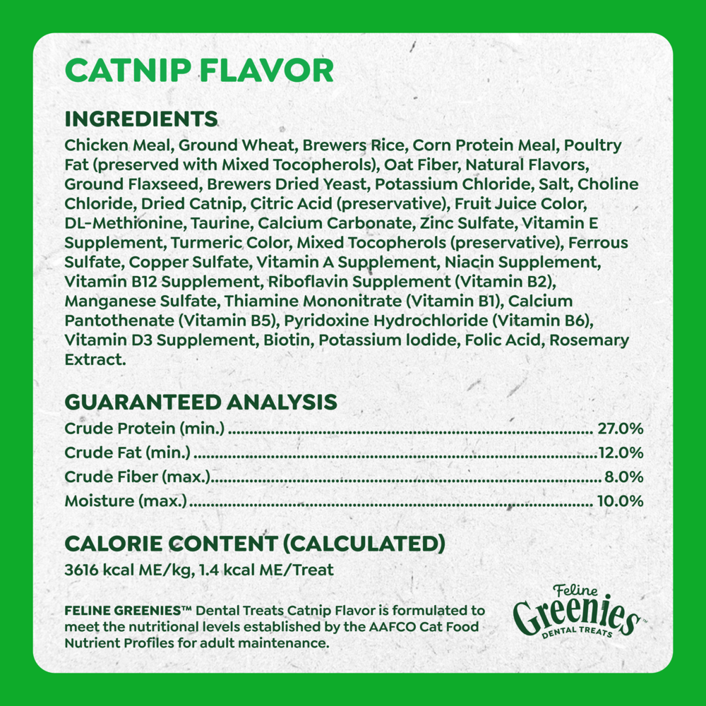 FELINE GREENIES Catnip Flavor Dental Cat Treats were designed to help keep your cat?s teeth clean and healthy. The crunchy texture of these irresistible cat snacks helps clean teeth, reduce tartar buildup, and freshen cat breath, letting you enjoy cuddle time even more. Made with natural ingredients plus vitamins, minerals, and other nutrients, these tasty treats are also nutritionally complete and balanced for adult cats. Plus, FELINE GREENIES Dental Treats contain less than 2 calories per treat and are the #1 vet-recommended feline dental treat.* Give your cat FELINE GREENIES Dental Treats and you're sure to hear happy purrs of joy. FELINE GREENIES Daily Dental Treats... for healthy and happy dental care.* Among U.S. veterinarians who recommend dental treats for at-home oral care