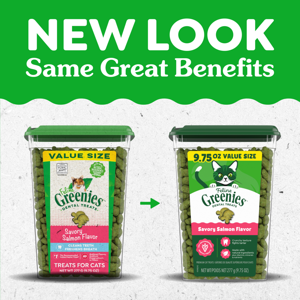 FELINE GREENIES Savory Salmon Flavor Dental Cat Treats were designed to help keep your cat?s teeth clean and healthy. The crunchy texture of these irresistible cat snacks helps clean teeth, reduce tartar buildup, and freshen cat breath, letting you enjoy cuddle time even more. Made with natural ingredients plus vitamins, minerals, and other nutrients, these tasty treats are also nutritionally complete and balanced for adult cats. Plus, FELINE GREENIES Dental Treats contain less than 2 calories per treat and are the #1 vet-recommended feline dental treat.* Give your cat FELINE GREENIES Dental Treats and you're sure to hear happy purrs of joy. FELINE GREENIES Daily Dental Treats... for healthy and happy dental care. * Among U.S. veterinarians who recommend dental treats for at-home oral care