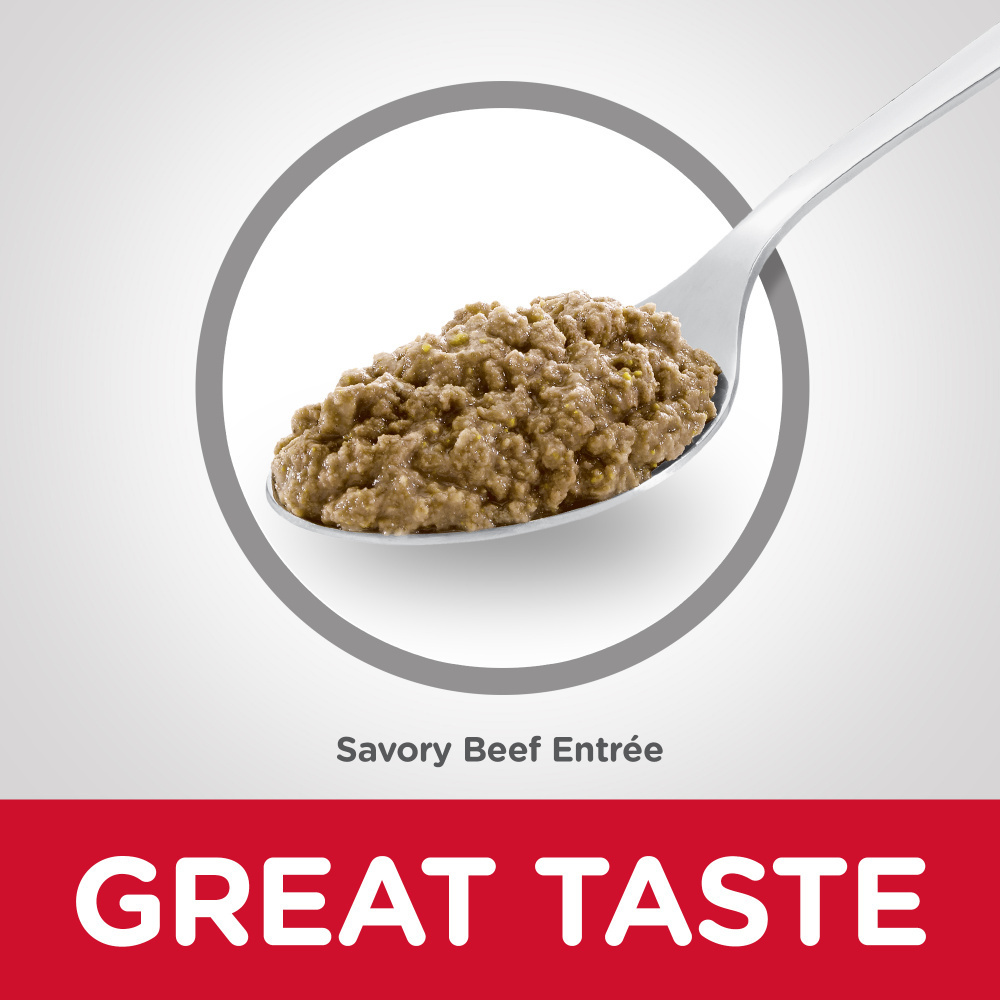 Packed with high-quality protein for lean muscle, Hill's Science Diet Adult 7+ Savory Beef Entree wet cat food provides precisely balanced nutrition for your cat's golden years. This easy-to-digest senior cat food made with natural ingredients is packed with antioxidants plus vitamin C and vitamin E for immune system support. There’s more to love with the new look of Science Diet®. Some of our products also have new names, new kibble shapes & new formulas.• High-quality protein to help your senior cat maintain lean muscle • Made with purposeful, easily digestible ingredients older cats enjoy • Supports your mature cat's immunity with clinically proven antioxidants and vitamins C+E • Heavenly wet food made with natural ingredients • Try all three flavors to give your furry feline the variety they crave • #1 Veterinarian Recommended Delicious taste of gourmet minced beef in precisely balanced nutrition. Provides a synergistic ingredient blend to help support energy & activity level.
