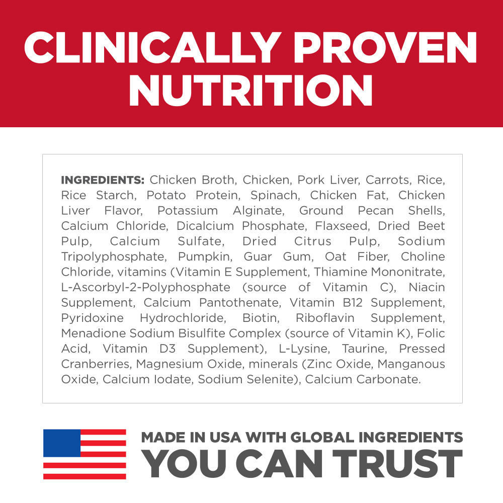 Chicken Broth, Chicken, Pork Liver, Carrots, Rice, Rice Starch, Potato Protein, Spinach, Chicken Fat, Chicken Liver Flavor, Potassium Alginate, Ground Pecan Shells, Calcium Chloride, Dicalcium Phosphate, Flaxseed, Dried Beet Pulp, Calcium Sulfate, Dried Citrus Pulp, Sodium Tripolyphosphate, Pumpkin, Guar Gum, Oat Fiber, Choline Chloride, vitamins (Vitamin E Supplment, Thiamine Mononitrate, L-Ascorbyl-2-Polyphosphate (source of Vitamin C), Niacin Supplement, Calcium Pantothenate, Vitamin B12 Supplement, Pyridoxine Hydrochloride, Biotin, Riboflavin Supplement, Menadoine Sodium Bisulfite Complex (source of Vitamin K), Folic Acid, Vitamin D3 Supplement), L-Lysine, Taurine, Pressed Cranberries, Magnesium Oxcide, minerals (Zinc Oxide, Manganous Oxide, Calcium Iodate, Sodium Selenite), Calcium Carbonate