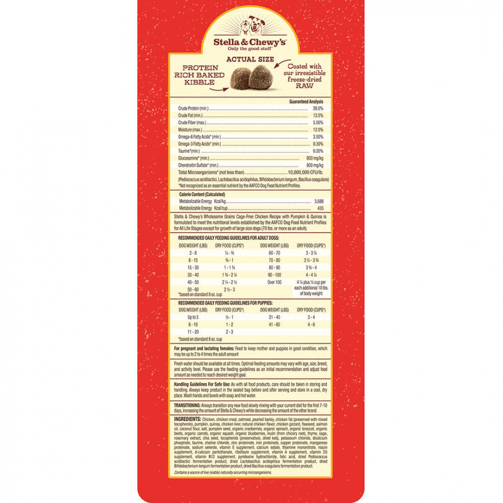 Chicken, chicken meal, oatmeal, pearled barley, chicken fat (preserved with mixed tocopherols), pumpkin, quinoa, chicken liver, natural chicken flavor, chicken gizzard, flaxseed, salmon oil, coconut flour, salt, pumpkin seed, organic cranberries, organic spinach, organic beets, organic carrots, organic squash, organic blueberries, inulin (from chicory root), thyme, sage, rosemary extract, tocopherols (preservative), dried kelp, potassium chloride, dicalcium phosphate, taurine, choline chloride, zinc proteinate, iron proteinate, copper proteinate, manganese proteinate, sodium selenite, vitamin E supplement, calcium iodate, thiamine mononitrate, niacin supplement, d-calcium pantothenate, riboflavin supplement, vitamin A supplement, vitamin D3 supplement, vitamin B12 supplement, pyridoxine hydrochloride, folic acid, dried Pediococcus acidilactici fermentation product, dried Lactobacillus acidophilus fermentation product, dried Bifidobacterium longum fermentation product, dried Bacillus coagulans fermentation productGuaranteed Analysis