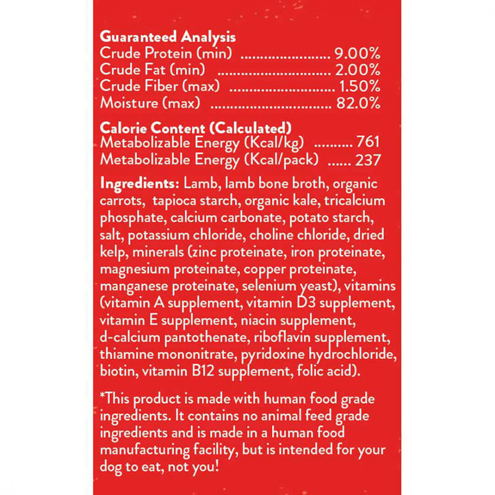 Lamb, lamb bone broth, organic carrots, tapioca starch, organic kale, tricalcium phosphate, calcium carbonate, potato starch, salt, potassium chloride, choline chloride, dried kelp, minerals (zinc proteinate, iron proteinate, magnesium proteinate, copper proteinate, manganese proteinate, selenium yeast), vitamins (vitamin A supplement, vitamin D3 supplement, vitamin E supplement, niacin supplement, d-calcium pantothenate, riboflavin supplement, thiamine mononitrate, pyridoxine hydrochloride, biotin, vitamin B12 supplement, folic acid).Guaranteed Analysis