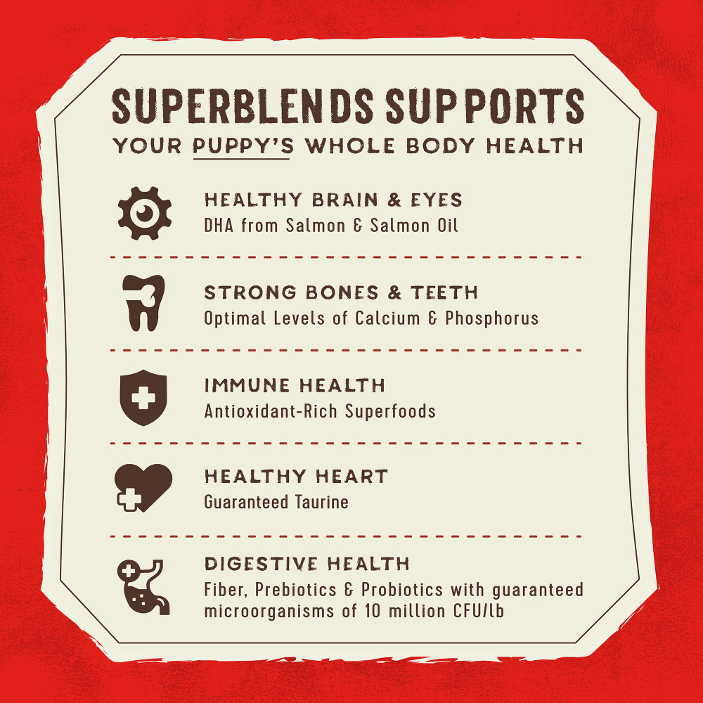 Crafted with your pets health in mind SuperBlends come in four irresistible recipes in your choice of Raw Coated or Raw Blend formulas that are sure to satisfy even the pickiest eaters.CageFree Chicken & Duck Recipe.WildCaught Whitefish & Salmon Recipe.GrassFed Beef Beef Liver & Lamb Recipe.Puppy CageFree Chicken & WildCaught Salmon Recipe.Each recipe is rawcoated and superfoodpowered giving your dog the maximum flavor and nutrition in every bite. Our smallbatch ovenbaking process helps preserve all the nutrients your dog needs to stay healthy and strong. All of our SuperBlends recipes are complete and balanced meals giving your dog everything they need in one bag. Our Raw Blend recipes even have pieces of freezedried raw meat mixed right in for an extra protein boost.