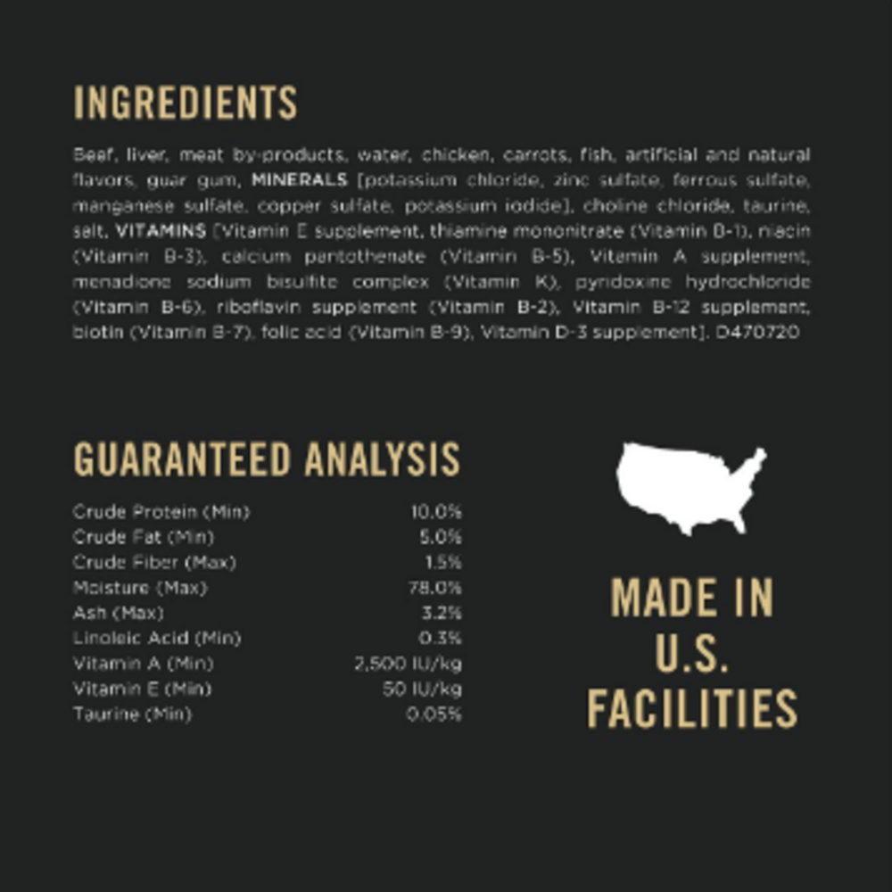 Water sufficient for processing, beef, liver, wheat gluten, meat by-products, carrots, corn starch-modified, artificial and natural flavors, salt, corn oil, soy protein concentrate, tricalcium phosphate, added color, potassium chloride, taurine, choline chloride, Vitamin E supplement, thiamine mononitrate, zinc sulfate, ferrous sulfate, niacin, calcium pantothenate, Vitamin A supplement, menadione sodium bisulfite complex (source of Vitamin K activity), copper sulfate, manganese sulfate, pyridoxine hydrochloride, riboflavin supplement, Vitamin B-12 supplement, biotin, folic acid, Vitamin D-3 supplement, and potassium iodide