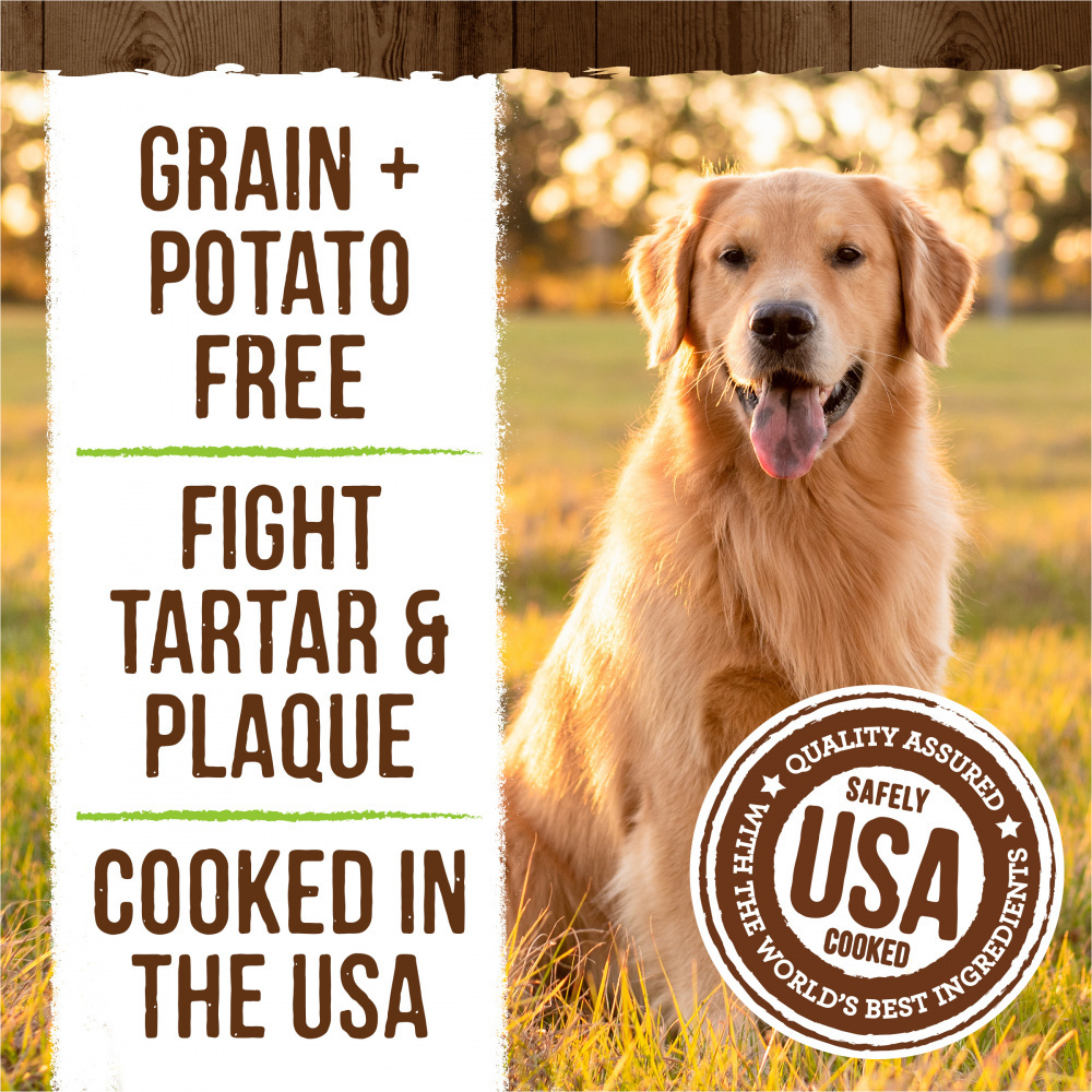 Sniff out the secret to fresh doggy breath with Merrick Fresh Kisses Mint Breath Strips Double-Brush Dental Dog Chews for large dogs. Sized specifically for large breed dogs weighing over 50 pounds, these all natural dog treats deliver two big benefits: dog teeth cleaning and truly fresher breath. The double-brush design mint dog chews clean your dog’s teeth like no other dental dog chew. These grain free dog treats infused with real mint are also potato free. With only 10 ingredients, these large dog chews will be a hit. Fresh Kisses dental chews for dogs are soft dog treats to effectively fight plaque and tartar from your dog's teeth as they chew, yet tough enough to last while they enjoy a happy chewing session. Merrick dog treats have peppermint flakes for fresh breath and are cooked in the USA. Fresh Kisses chewy dog treats are easily digestible, so make sure to feed daily to clean teeth and freshen breath.