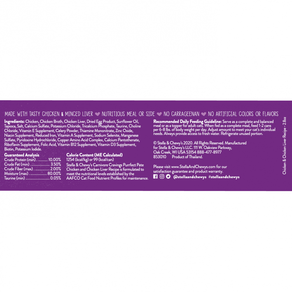 A tender, meaty and moist paté with a light broth will entice the pickiest of cats! Give your cat what they naturally crave with the protein-rich nutrition of Stella & Chewy's Carnivore Cravings Purrfect Patés.