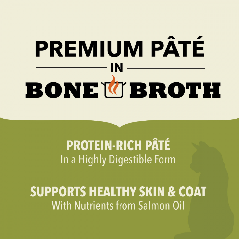 Chicken, tuna, chicken bone broth, fish bone broth, chicken liver, salmon oil, tricalcium phosphate, locust bean gum, taurine, salt, vitamins [vitamin E supplement, thiamine mononitrate, niacin, vitamin A supplement, pyridoxine hydrochloride, calcium pantothenate, riboflavin supplement, folic acid, vitamin D3 supplement, biotin, vitamin B12 supplement, menadione sodium bisulfite complex], guar gum, minerals [potassium chloride, magnesium sulfate, zinc amino acid chelate, iron amino acid chelate, copper amino acid chelate, manganese amino acid chelate, sodium selenite, potassium iodide], choline chloride.