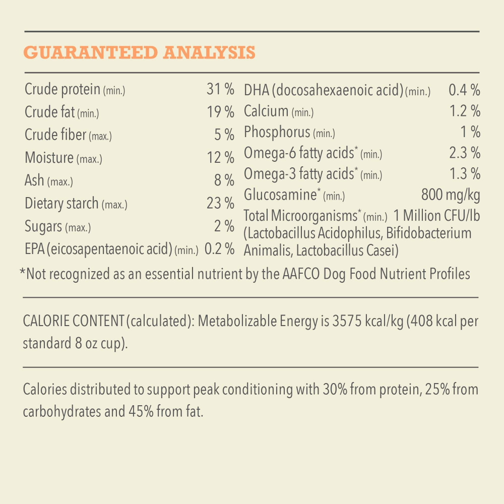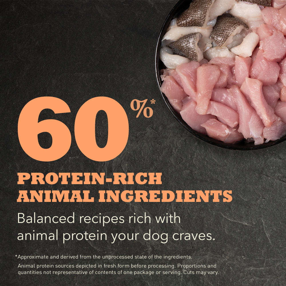 - High protein dog food recipe features free-run chicken and free-run turkey and eggs and is balanced to include 65%** high-quality animal ingredients and 35%*** wholesome fruits, vegetables and nutrients