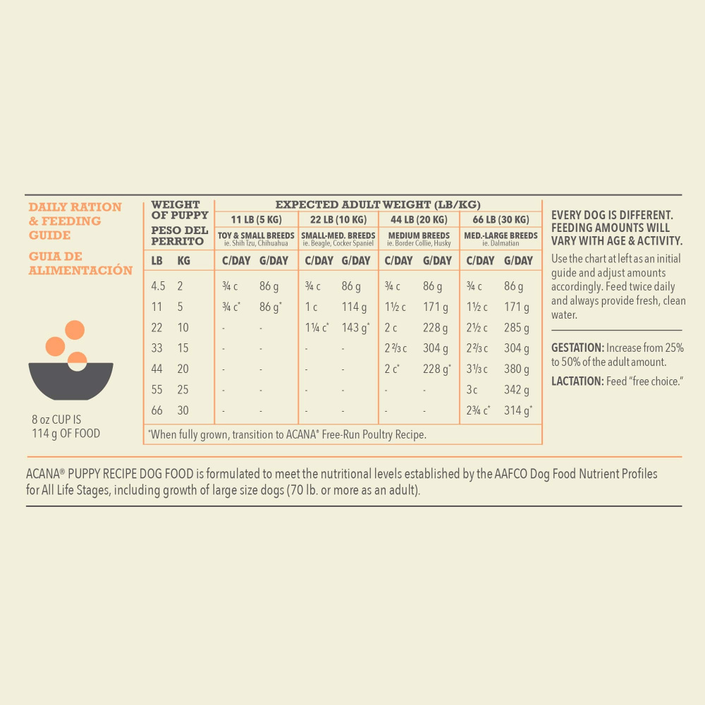 Bring home the quality nutrition your puppy needs to thrive with ACANA Grain Free* Puppy Recipe Dry Dog Food. This high protein dog food is made for puppies with protein and fat from quality animal protein to support their development. Free-run chicken and free-run turkey and eggs are balanced with whole pumpkin, collard greens, apples and pears to create a protein-rich, nutritious puppy dog food. This ACANA dog food for puppies is 65%** quality animal ingredients and 35%*** wholesome fruits and vegetables. Even better, this grain free* dog food has a freeze dried coating for a delicious taste your puppy will crave. Choose ACANA dry dog food kibble to give your companion the nutritional foundation they need to live a happy, healthy life. *Produced in a facility that also processes grains**Approximate and derived from the unprocessed state of the ingredients***We also add vitamins, minerals, natural preservatives, flavors and probiotics