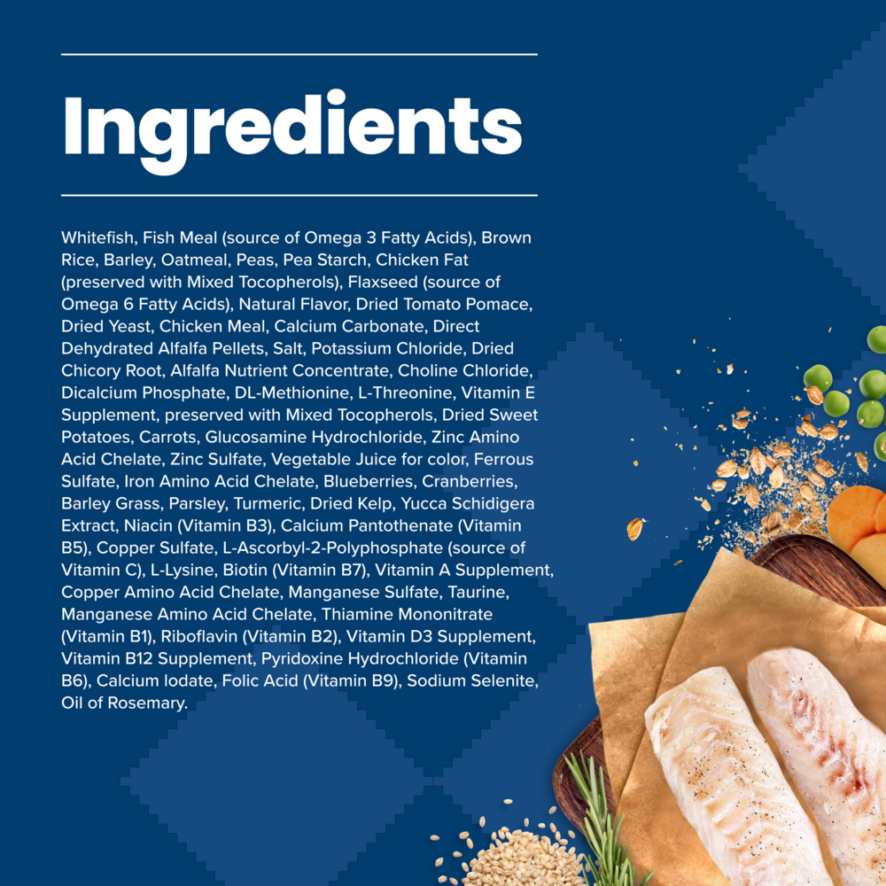 Whitefish,Menhaden Fish Meal (source of Omega 3 Fatty Acids),Brown Rice,Barley,Oatmeal,Pea Starch,Peas,Chicken Fat (preserved with Mixed Tocopherols),Flaxseed (source of Omega 6 Fatty Acids),Natural Flavor,Chicken Meal,Dried Tomato Pomace,Pea Protein,Dehydrated Alfalfa Meal,Salt, Potassium Chloride, Calcium Carbonate,Potatoes,Dried Chicory Root,Pea Fiber,Alfalfa Nutrient Concentrate,Choline Chloride,DL-Methionine,Sweet Potatoes,Carrots,preserved with Mixed Tocopherols,Garlic,Glucosamine Hydrochloride, Zinc Amino Acid Chelate,Zinc Sulfate,Vegetable Juice for color,Ferrous Sulfate,Vitamin E Supplement,Iron Amino Acid Chelate,Blueberries,Cranberries,Barley Grass,Parsley,Turmeric,Dried Kelp,Yucca Schidigera Extract,Niacin (Vitamin B3),Calcium Pantothenate (Vitamin B5),L-Ascorbyl-2-Polyphosphate (source of Vitamin C),L-Lysine,Copper Sulfate,Biotin (Vitamin B7),L-Carnitine,Vitamin A Supplement,Copper Amino Acid Chelate,Manganese Sulfate,Taurine,Manganese Amino Acid Chelate,Thiamine Mononitrate (Vitamin B1),Riboflavin (Vitamin B2),Vitamin D3 Supplement,Vitamin B12 Supplement,Pyridoxine Hydrochloride (Vitamin B6),Calcium Iodate,Dried Yeast,Dried Enterococcus faecium fermentation product,Dried Lactobacillus acidophilus fermentation product,Dried Aspergillus niger fermentation extract,Dried Trichoderma longibrachiatum fermentation extract,Dried Bacillus subtilis fermentation extract,Folic Acid (Vitamin B9),Sodium Selenite,Oil of RosemaryGuaranteed Analysis